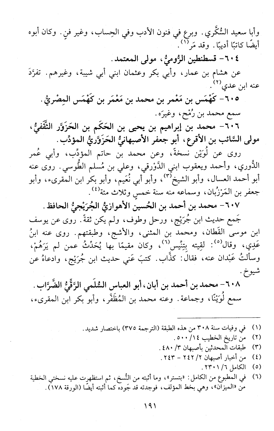 606 - محمد بْن إبراهيم بْن يحيى بْن الحَكَم بْن الحزَوَّر الثَّقْفيّ. مولى السّائب بْن الأقرع، أبو جعفر الإصبهانيّ الحزَوَّريّ المؤدِّب. [الوفاة: 301 - 310 هـ]