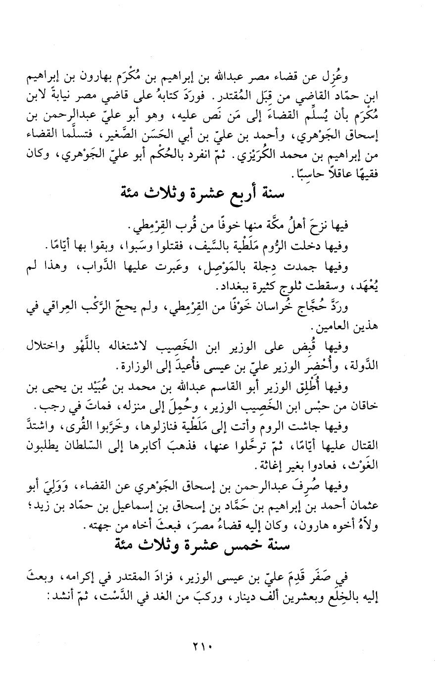 وفيها: قبض عَلَى الوزير ابن الخصيب لاشتغاله باللهو واختلال الدولة، وأحضر الوزير عليّ بْن عيسى فأعيد إلى الوزارة.