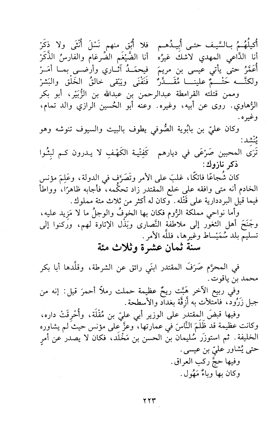 وفيها: جاءت الأخبار بأنّ الأمير مفلحًا السّاجيّ هزم جيشًا من الروم، وفرح النّاسُ.