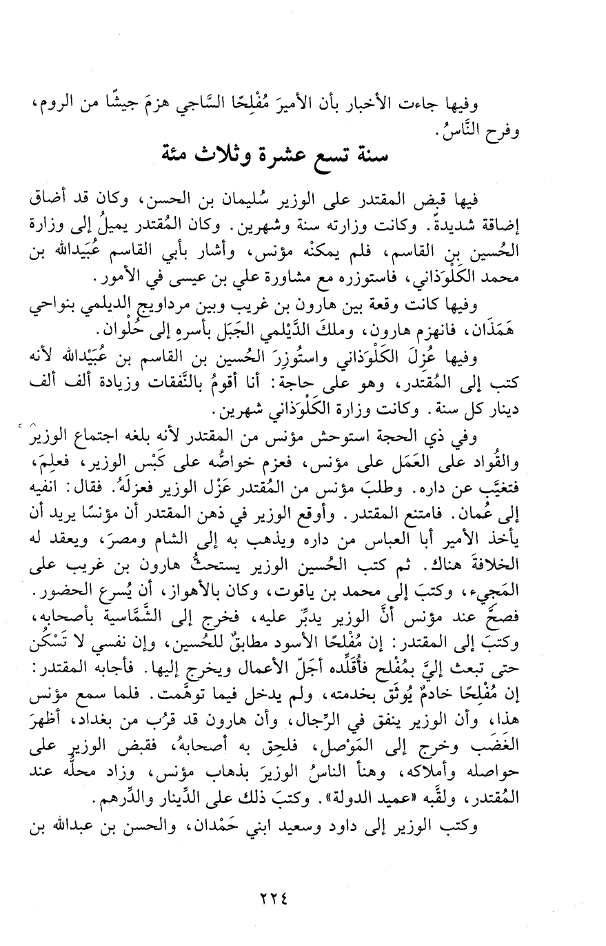 فيها قبض المقتدر عَلَى الوزير سليمان بْن الحَسَن، وكان قد أضاق إضاقة شديدة. وكانت وزارته سنة وشهرين. وكان المقتدر يميل إلى وزارة الحُسين بْن القاسم، فلم يمكنه مؤنس، وأشار بأبي القاسم عُبَيْد اللَّه بْن محمد الكَلَوْذَانيّ. فاستوزره مَعَ مشاورة عليّ بْن عيسى في الأمور.