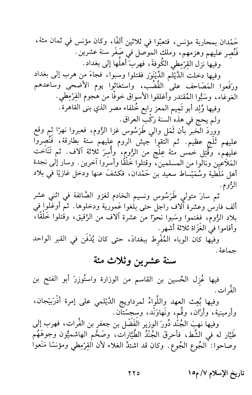 وفيها: نهب الْجُنْد دور الوزير الفضل بْن جعفر بْن الفُرات، فهرب إلى طيّار لَهُ في الشط، فأحرقَ الْجُنْد الطّيّارات. وصخَّم الهاشميّون وجوههم وصاحوا: الجوع الجوع! وكان قد اشتدّ الغلاء؛ لأنّ القَرْمَطيّ ومؤنسًا منعُوا -[226]- الغلّات من النّواحي أنّ تصل، ولم يحجّ ركب العراق.