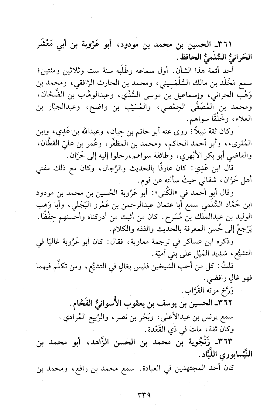361 - الحُسين بْن محمد بْن مودود، أبو عَرُوبَة بْن أَبِي مَعْشَر الحرّانيّ السُّلَميّ الحافظ. [المتوفى: 318 هـ]