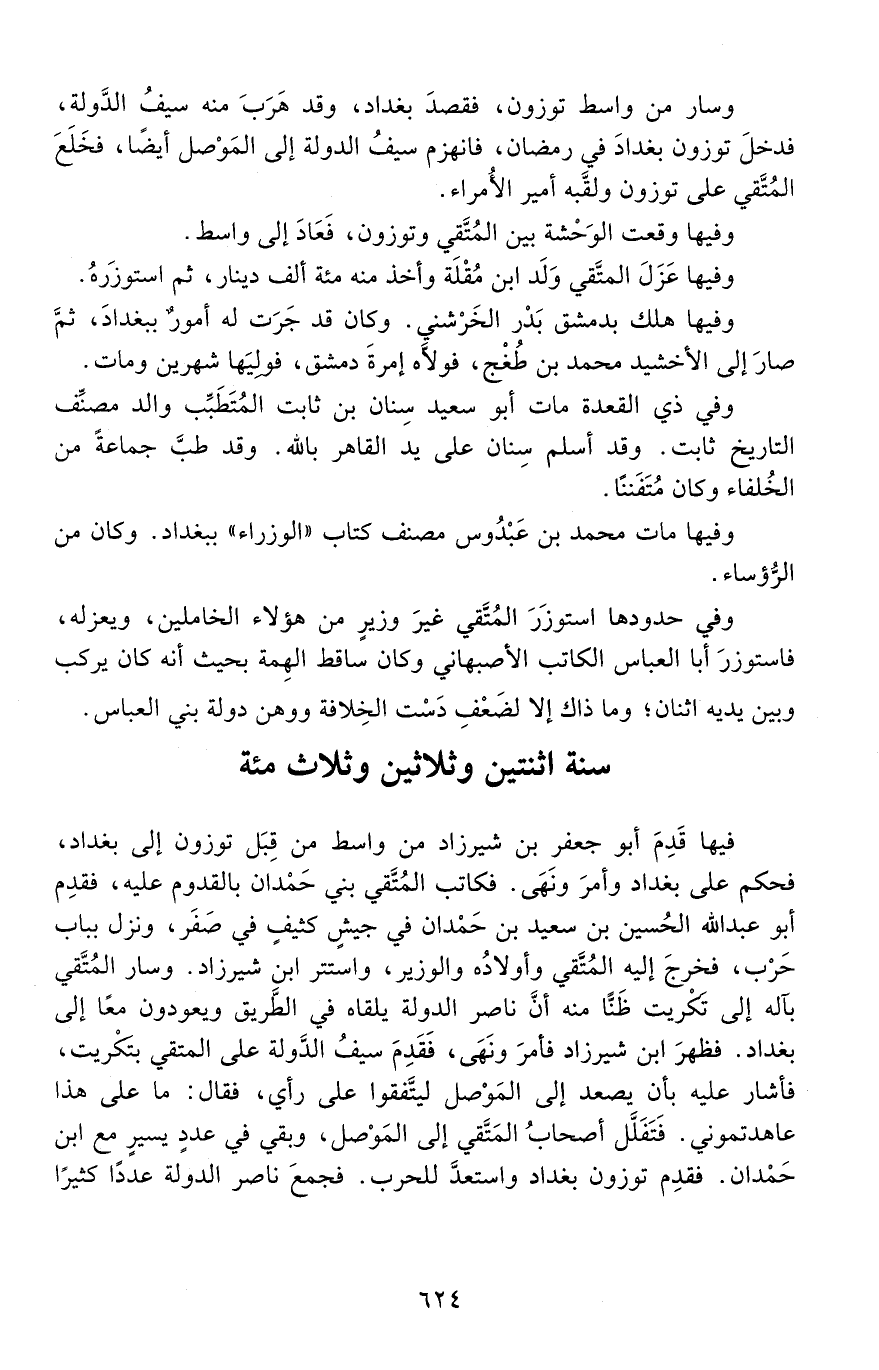 فيها قدّم أبو جعفر بن شيرزاد من واسط من قبل توزون إلى بغداد، فحكم على بغداد وأمّر ونهي. فكاتب المتّقي بني حمدان بالقدوم عليه، فقدِم أبو عبد الله الحسين بن سعيد بن حمدان في جيشٍ كثيف في صَفَر، ونزل بباب حرب، فخرجَ إليه المتقّي وأولاده والوزير. واستتر ابن شيرزاد. وسار المتقي بآله إلى تِكريت ظنًّا منه أنّ ناصر الدّولة يلقاه في الطّريق ويعودون معًا إلى بغداد. فظهرَ ابن شيرزاد فأمرَ ونهي، فقدِم سيف الدّولة على المتقّي بتكريت فأشار عليه بأن يصعد إلى المَوْصل ليتّفقوا على رأي، فقال: ما على هذا عاهدتموني. فتفلّل أصحاب المتقّي إلى الموصل، وبقي في عددٍ يسير مع ابن حمدان. فقِدم توزون بغداد واستعدّ للحرب. فجمع ناصر الدّولة عددًا كثيرًا -[625]- من الأعراب والأكراد، وسارَ بهم إلى تكريت. وكان الملتَقَى بينه وبين توزون بُعكبرا، واقتتلوا أيّامًا، ثمّ انهزم بنو حمدان والمتقّي إلى الموصل. وراسل ناصر الدّولة توزون في الصّلح على يد أبي عبد الله بن أبي موسى الهاشميّ، وكان توزون على تِكْريت، فتسلل بعض أصحابه إلي ابن حمدان، وردّ توزون إلي بغداد.