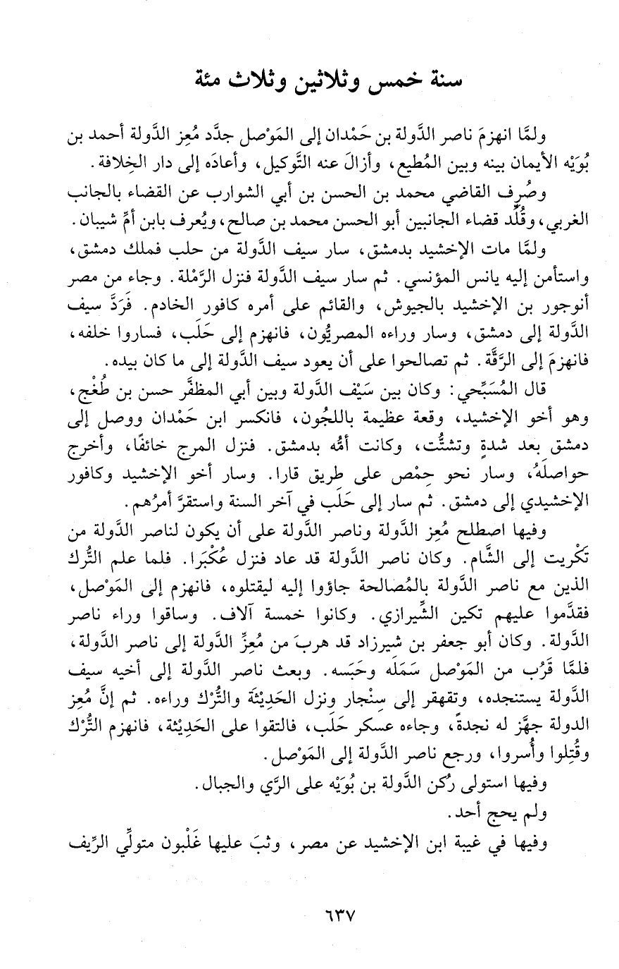 وفيها اصطلح معز الدولة وناصر الدولة على أن يكون لناصر الدّولة من تكريت إلى الشّام. وكان ناصر الدّولة قد عاد فنزل عُكبراً. فلمّا علم التُّرك الّذين مع ناصر الدّولة بالمصالحة جاؤوا إليه ليقتلوه، فانهزم إلى الموصل، فقدموا عليهم تكين الشيرازيّ. وكانوا خمسة آلاف. وساقوا وراء ناصر الدّولة. وكان أبو جعفر بن شيرزاد قد هرب من معزّ الدّولة إلى ناصر الدّولة، فلّما قُرب من الموصل سَمَلَه وحبسه. وبعث ناصر الدّولة إلي أخيه سيف الدّولة يستنجده، وتقهقر إلى سنجار، ونزل الحُديثة والتُرك وراءه. ثمّ إنّ مُعزّ الدّولة جهَّز له نجدة، وجاءه عسكر حلب، فالتقوا على الحُديثة، فانهزم التُرْك وقُتلوا وأُسروا، ورجع ناصر الدّولة إلى الموصل.