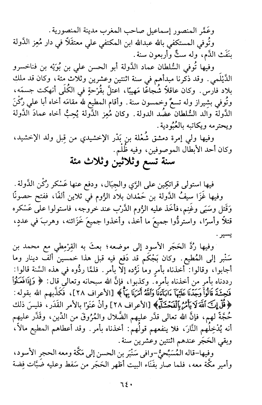 وفيها رُد الحج الأسود إلي موضعه. بعث به القَرْمَطّي مع محمد بن سنَبْر إلى المطيع. وكان بجَكَم قد دفَع فيه قبل هذا خمسين ألف دينار وما أجابوا، وقالوا: أخذناه بأمرٍ وما نردّه إلا بأمر. فلمّا ردّوه في هذه السنة قالوا: رددناه بأمرِ من أخذناه بأمره. وكذبوا، فإنّ الله سبحانه وتعالى قال: " {وَإِذَا فَعَلُوا فَاحِشَةً قَالُوا وَجَدْنَا عَلَيْهَا آبَاءَنَا وَاللَّهُ أَمَرَنَا بِهَا} "، فكذبهم الله بقوله: " {قُلْ إِنَّ اللَّهَ لا يَأْمُرُ بِالْفَحْشَاءِ} " وإن عَنَوْا بالأمر القدَرَ، فليس ذلك حُجة لهم، فإنّ الله - تعالى - قدَّر عليهم الضّلال والمُرُوقَ مِن الدين، وقدَّر عليهم أنه يدخلهم النار، فلا ينفعهم قولُهم: أخذناه بأمر. وقد أعطاهم المطيع مالًا، وبقي الحجر عندهم اثنتين وعشرين سنة.