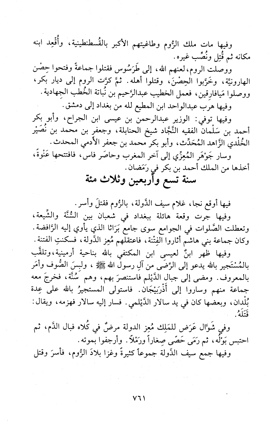 وفيها جمع سيف الدولة جموعا كثيرة وغزا بلاد الروم، فأسر وقتل -[762]- وسبى، فثارت الروم وكثروا عَلَيْهِ، فعاد فِي ثلاثمائة من خواصة، وذهب جميع ما كَانَ معه، وقتل أعيان قواده، وخرج من ناحية طرسوس.