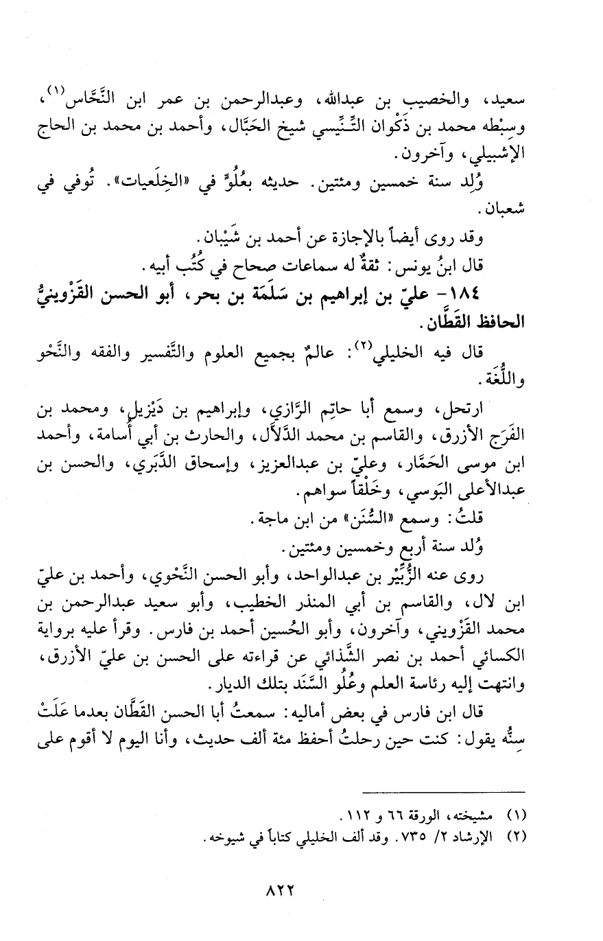 184 - عَلِيّ بْن إبْرَاهِيم بْن سَلَمَةَ بْن بحر، أَبُو الْحُسَن القَزْوِينيّ الحافظ القطّان. [المتوفى: 345 هـ]