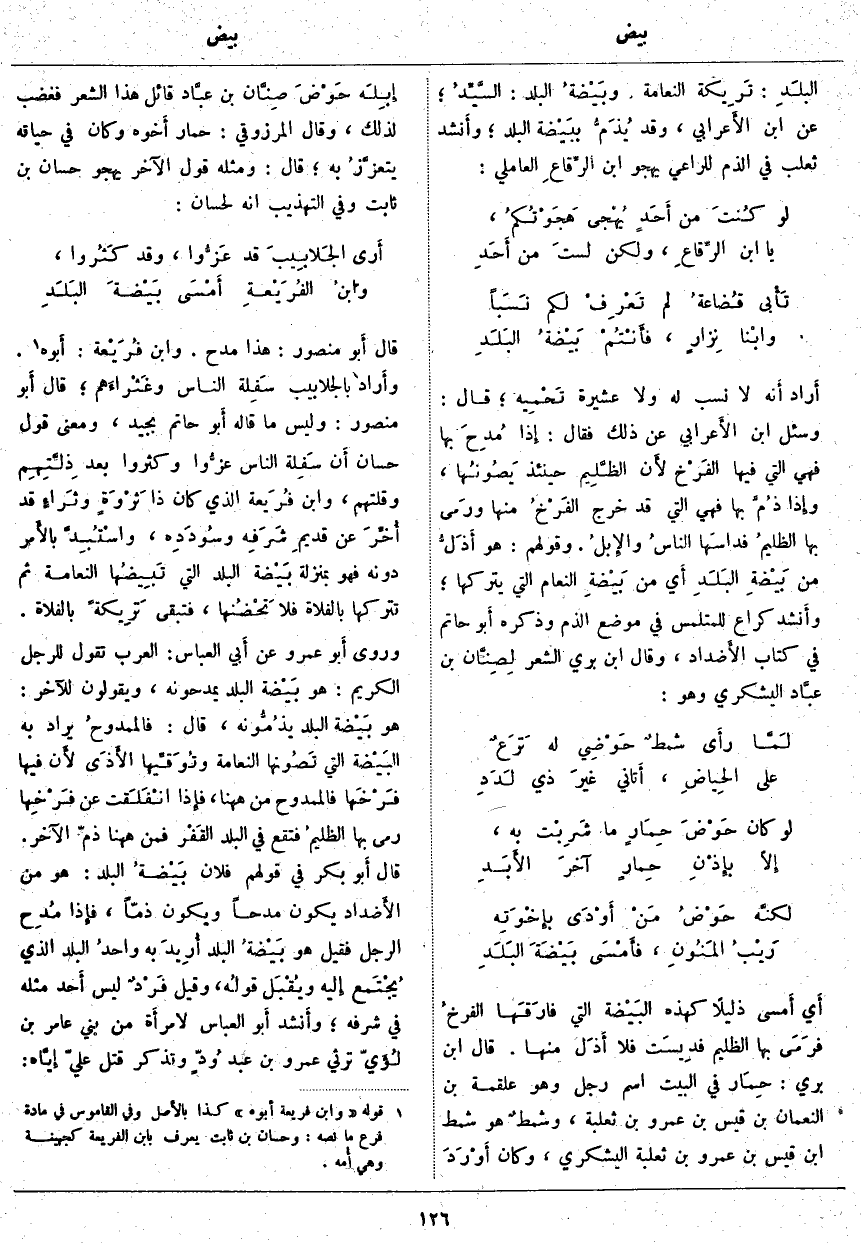 قَالَ أَبو مَنْصُورٍ: هَذَا مَدْحٌ. وَابْنُ فُرَيْعة: أَبوه «1». وأَراد بِالْجَلَابِيبِ سَفِلة النَّاسِ وغَثْراءَهم؛ قَالَ أَبو مَنْصُورٍ: وَلَيْسَ مَا قَالَهُ أَبو حَاتِمٍ بِجَيِّدٍ، وَمَعْنَى قَوْلُ حَسَّانَ أَن سَفِلة النَّاسِ عزُّوا وَكَثُرُوا بَعْدَ ذِلَّتِهِم وَقِلَّتِهِمْ، وَابْنُ فُرَيعة الَّذِي كَانَ ذَا ثَرْوَةٍ وثَراءٍ قَدْ أُخِّرَ عَنْ قديمِ شَرَفِه وسُودَدِه، واسْتُبِدَّ بالأَمر دُونَهُ فَهُوَ بِمَنْزِلَةِ بَيْضة الْبَلَدِ الَّتِي تَبِيضُها النَّعَامَةُ ثُمَّ تَتْرُكُهَا بِالْفَلَاةِ فَلَا تَحْضُنها، فَتَبْقَى تَرِيكةً بِالْفَلَاةِ. وَرَوَى أَبو عَمْرٍو عَنْ أَبي الْعَبَّاسِ: الْعَرَبُ تَقُولُ لِلرَّجُلِ الْكَرِيمِ: هُوَ بَيْضة الْبَلَدِ يَمْدَحُونَهُ، وَيَقُولُونَ لِلْآخَرِ: هُوَ بَيْضة الْبَلَدِ يذُمُّونه، قَالَ: فالممدوحُ يُرَادُ بِهِ البَيْضة الَّتِي تَصُونها النَّعَامَةُ وتُوَقِّيها الأَذَى لأَن فِيهَا فَرْخَها فَالْمَمْدُوحُ من هاهنا، فإِذا انْفَلَقت عَنْ فَرْخِها رَمَى بِهَا الظليمُ فَتَقَعُ فِي الْبَلَدِ القَفْر فَمِنْ هاهنا ذُمَّ الْآخَرُ. قَالَ أَبو بَكْرٍ فِي قَوْلِهِمْ فُلَانٌ بَيْضةُ الْبَلَدِ: هُوَ مِنَ الأَضداد يَكُونُ مَدْحًا وَيَكُونُ ذَمًّا، فإِذا مُدِح الرَّجُلُ فَقِيلَ هُوَ بَيْضةُ الْبَلَدِ أُرِيدَ بِهِ واحدُ الْبَلَدِ الَّذِي يُجْتَمع إِليه ويُقْبَل قولُه، وَقِيلَ فَرْدٌ لَيْسَ أَحد مِثْلَهُ فِي شَرَفِهِ؛ وأَنشد أَبو الْعَبَّاسِ لامرأَة مِنْ بَنِي عَامِرِ بْنِ لُؤَيّ تَرْثِي عَمْرَو بْنِ عَبْدِ وُدٍّ وَتَذْكُرُ قَتْلَ عليّ إِيَّاه: