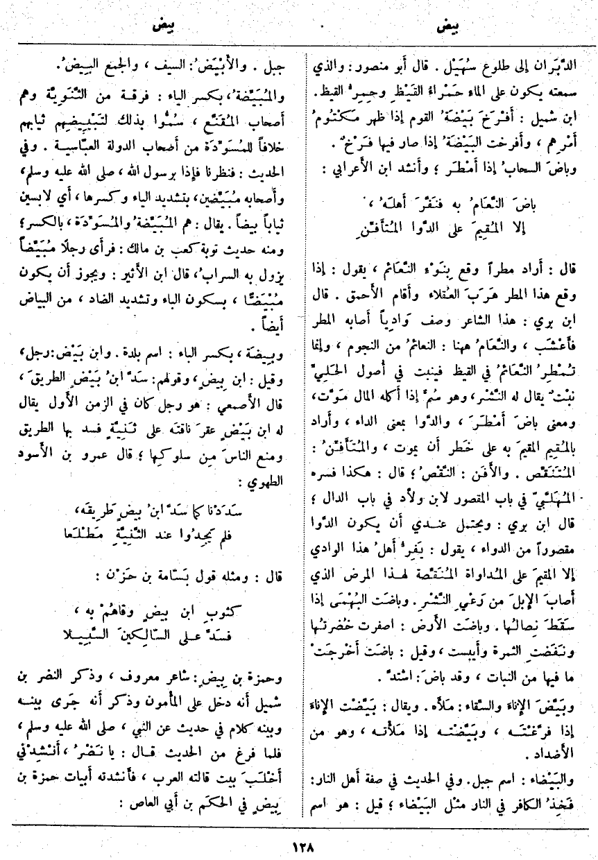 ؛ قِيلَ: هُوَ اسْمُ جَبَلٍ. والأَبْيَضُ: السَّيْفُ، وَالْجَمْعُ البِيضُ. والمُبَيِّضةُ، بِكَسْرِ الْيَاءِ: فِرْقَةٌ مِنَ الثَّنَوِيَّة وَهُمْ أَصحاب المُقَنَّع، سُمُّوا بِذَلِكَ لتَبْيِيضهم ثِيَابَهُمْ خِلَافًا للمُسَوِّدَة مِنْ أَصحاب الدَّوْلَةِ الْعَبَّاسِيَّةِ. وَفِي الْحَدِيثِ:
