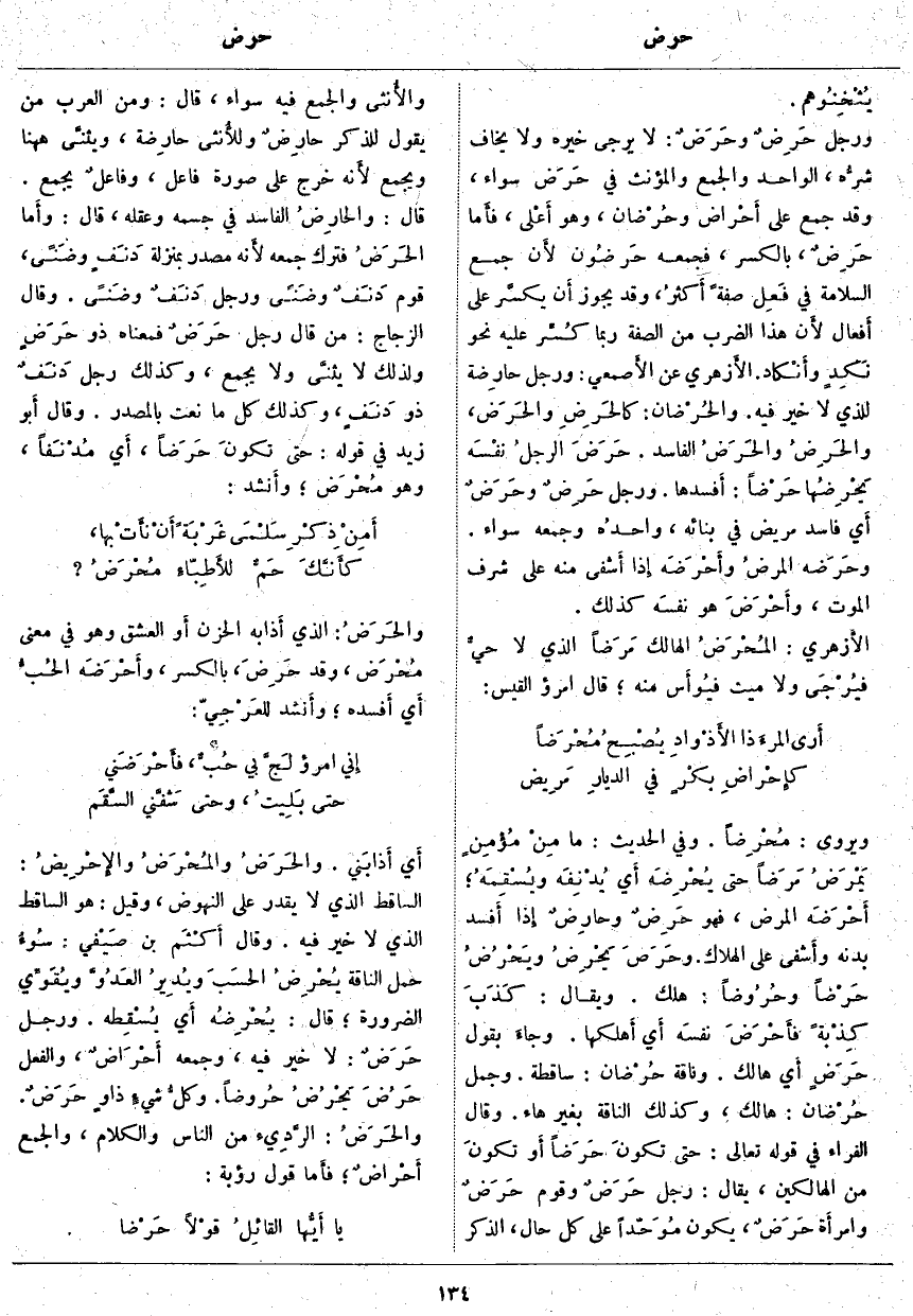 يُثْخِنُوهم. وَرَجُلٌ حَرِضٌ وحَرَضٌ: لَا يُرْجَى خَيْرُهُ وَلَا يُخَافُ شرُّه، الْوَاحِدُ وَالْجَمْعُ وَالْمُؤَنَّثُ فِي حَرَض سَوَاءٌ، وَقَدْ جُمِعَ عَلَى أَحْراض وحُرْضان، وَهُوَ أَعْلى، فأَما حَرِضٌ، بِالْكَسْرِ، فَجَمْعُهُ حَرضُون لأَن جَمْعَ السَّلَامَةِ فِي فَعِل صِفَةً أَكثرُ، وَقَدْ يَجُوزُ أَن يكسَّر عَلَى أَفعال لأَن هَذَا الضَّرْبَ مِنَ الصِّفَةِ رُبَّمَا كُسِّر عَلَيْهِ نَحْوُ نَكِدٍ وأَنْكاد. الأَزهري عَنِ الأَصمعي: وَرَجُلٌ حارِضة لِلَّذِي لَا خَيْرَ فِيهِ. والحُرْضان: كالحَرِضِ والحَرَض، والحَرِضُ والحَرَضُ الْفَاسِدُ. حَرَضَ الرجلُ نفْسَه يَحْرِضُها حَرْضاً: أَفسدها. وَرَجُلٌ حَرِضٌ وحَرَضٌ أَي فَاسِدٌ مَرِيضٌ فِي بِنَائِهِ، واحدُه وَجَمْعُهُ سَوَاءٌ. وحَرَضه المرضُ وأَحْرَضَه إِذا أَشفى مِنْهُ عَلَى شَرَفِ الْمَوْتِ، وأَحْرَضَ هُوَ نفسَه كَذَلِكَ. الأَزهري: المُحْرَضُ الْهَالِكُ مَرَضاً الَّذِي لَا حيٌّ فيُرْجَى وَلَا مَيِّتٌ فيُوأَس مِنْهُ؛ قَالَ امْرُؤُ الْقَيْسِ: