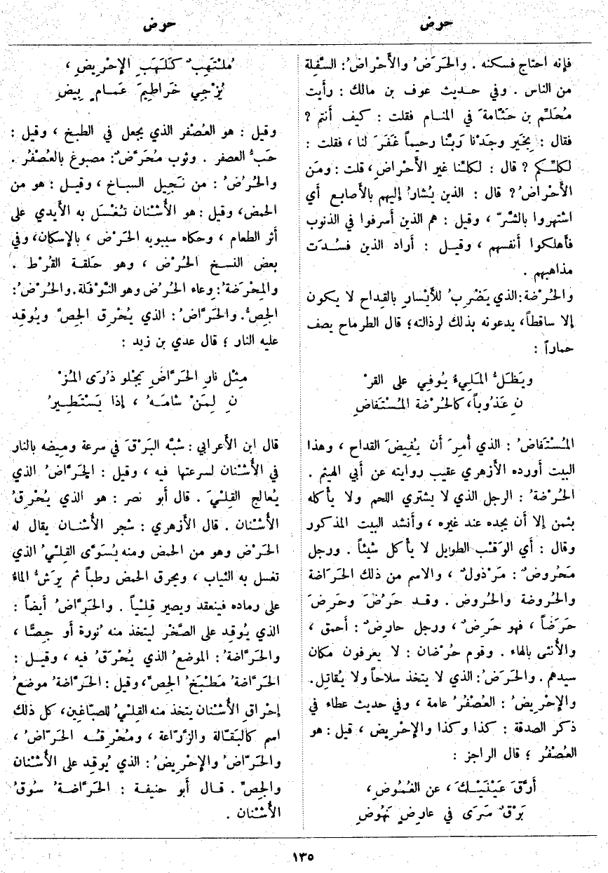 المُسْتَفاضُ: الَّذِي أُمِرَ أَن يُفِيضَ الْقِدَاحَ، وَهَذَا الْبَيْتُ أَورده الأَزهري عُقَيْبَ رِوَايَتِهِ عَنْ أَبي الْهَيْثَمِ. الحُرْضةُ: الرَّجُلُ الَّذِي لَا يَشْتَرِي اللَّحْمَ وَلَا يأْكله بِثَمَنٍ إِلا أَن يَجِدَهُ عِنْدَ غَيْرِهِ، وأَنشد الْبَيْتَ الْمَذْكُورَ وَقَالَ: أَي الوَقْب الطَّوِيلُ لَا يأْكل شَيْئًا. وَرَجُلٌ مَحُروضٌ: مَرْذولٌ، وَالِاسْمُ مِنْ ذَلِكَ الحَرَاضة والحُروضة والحُروض. وَقَدْ حَرُضَ وحَرِضَ حَرَضاً، فَهُوَ حَرِضٌ، وَرَجُلٌ حارِضٌ: أَحمق، والأُنثى بِالْهَاءِ. وَقَوْمٌ حُرْضان: لَا يَعْرِفُونَ مَكَانَ سَيِّدِهِمْ. والحَرَضُ: الَّذِي لَا يَتَّخِذُ سِلَاحًا وَلَا يُقاتِل. والإِحْرِيضُ: العُصْفُرُ عَامَّةً، وَفِي حَدِيثِ