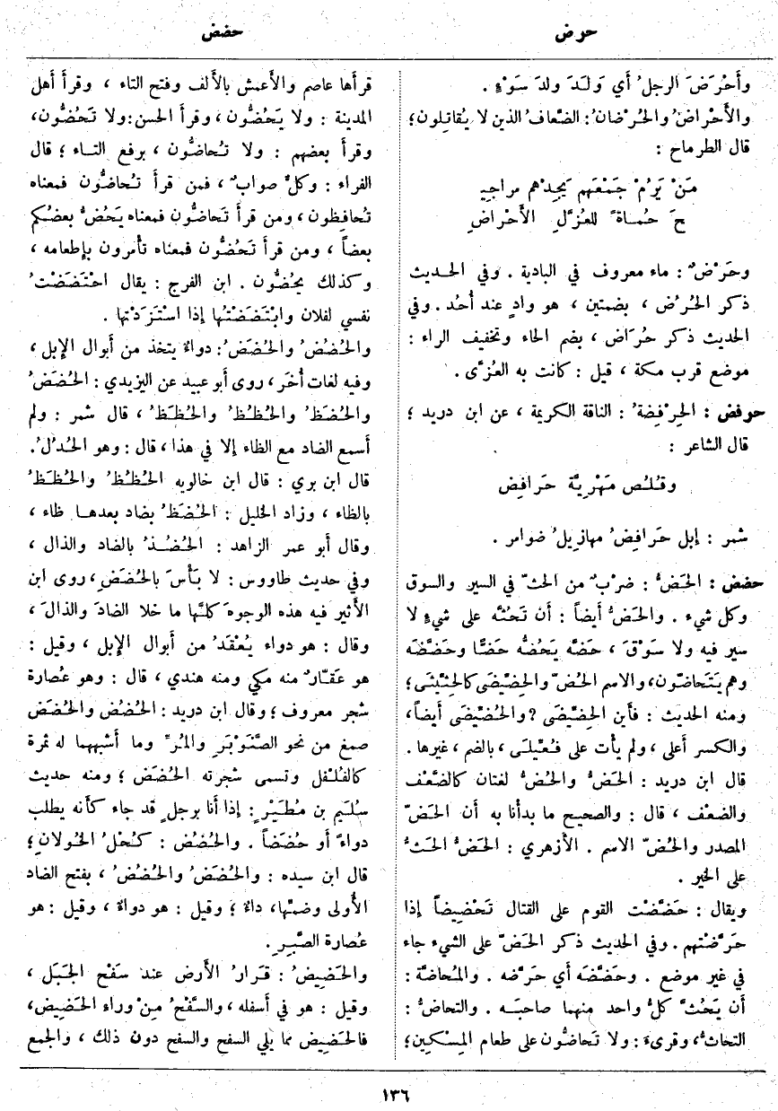 ، بِرَفْعِ التَّاءِ؛ قَالَ الْفَرَّاءُ: وكلٌّ صوابٌ، فَمَنْ قرأَ تُحاضُّون فَمَعْنَاهُ تُحافِظون، وَمَنْ قرأَ تَحاضُّون فَمَعْنَاهُ يَحُضُّ بعضُكم بَعْضًا، وَمَنْ قرأَ تَحُضُّون فَمَعْنَاهُ تأْمرون بإِطعامه، وَكَذَلِكَ يحُضُّون. ابْنُ الْفَرَجِ: يُقَالُ احْتَضَضْتُ نَفْسِي لِفُلَانٍ وابْتَضَضْتُها إِذا اسْتَزَدْتها. والحُضُضُ والحُضَضُ: دواءٌ يُتَّخَذُ مِنْ أَبوال الإِبل، وَفِيهِ لُغَاتٌ أُخَر، رَوَى أَبو عُبَيْدٍ عَنْ الْيَزِيدِيِّ: الحُضَضُ والحُضَظُ والحُظُظُ والحُظَظُ، قَالَ شَمِرٌ: وَلَمْ أَسمع الضَّادَ مَعَ الظَّاءِ إِلا فِي هَذَا، قَالَ: وَهُوَ الحُدُلُ. قَالَ ابْنُ بَرِّيٍّ: قَالَ ابْنُ خَالَوَيْهِ الحُظُظُ والحُظَظُ بِالظَّاءِ، وَزَادَ الْخَلِيلُ: الحُضَظُ بِضَادٍ بَعْدَهَا ظَاءٌ، وَقَالَ أَبو عُمَرَ الزَّاهِدُ: الحُضُذُ بِالضَّادِ والذال، وفي حديث