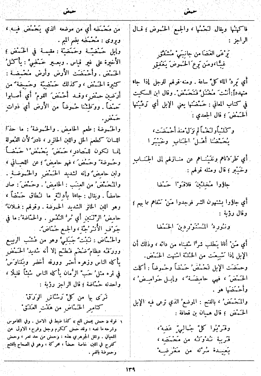 مِنْ مَحْمَضه أَي مِنْ مَوْضِعِهِ الَّذِي يَحْمُض فِيهِ، وَيُرْوَى: مُحْمَضه بِضَمِّ الْمِيمِ. وإِبل حَمْضيّة وحَمَضيّة: مُقِيمَةٌ فِي الحَمْض؛ الأَخيرة عَلَى غَيْرِ قِيَاسٍ. وَبَعِيرٌ حَمْضِيٌّ: يأْكُلُ الحَمْض. وأَحْمَضَت الأَرض وأَرض مُحْمِضَة: كَثِيرَةُ الحَمْض، وَكَذَلِكَ حَمْضِيّة وحَمِيضةٌ مِنْ أَرَضِين حِمْضٍ، وَقَدْ أَحْمَضَ القومُ أَي أَصابوا حَمْضاً. ووَطِئْنا حُموضاً مِنَ الأَرض أَي ذواتِ حَمْضٍ. والحُمُوضة: طَعْمُ الحامِض. والحُمُوضةُ: مَا حذَا اللسانَ كَطَعْمِ الْخَلِّ وَاللَّبَنِ الحازِر، نادرٌ لأَن الفُعولة إِنما تَكُونُ للمَصادرِ، حَمَضَ يَحْمُضُ «2» حَمْضاً وحُمُوضةً وحَمُضَ، فَهُوَ حَامِضٌ؛ عَنِ اللِّحْيَانِيِّ، وَلَبَنٌ حَامِضٌ وإِنه لَشَدِيدٌ الحَمْضِ والحُمُوضةِ. والمُحَمِّضُ مِنَ العِنَب: الحامِضُ. وحَمَّضَ: صَارَ حَامِضًا. وَيُقَالُ: جاءَنا بأَدِلَّةٍ مَا تُطاق حَمْضاً، وَهُوَ اللَّبَنُ الْخَاثِرُ الشَّدِيدُ الْحُمُوضَةِ. وَقَوْلُهُمْ: فلانٌ حَامِضُ الرِّئَتينِ أَي مُرُّ النَّفْسِ. والحمَّاضةُ: مَا فِي جَوْفِ الأُتْرُجَّةِ، وَالْجَمْعُ حُمَّاضٌ. والحُمَّاض: نَبْتٌ جَبَلِيٌّ وَهُوَ مِنْ عُشْب الرَّبِيعِ وورَقُه عِظامٌ ضُخْم فُطْح إِلا أَنه شديدُ الحَمْضِ يأْكله النَّاسُ وَزَهْرُهُ أَحمر وَوَرَقُهُ أَخضر ويَتناوَسُ فِي ثَمَرِهِ مثلُ حَبِّ الرُّمان يأْكله النَّاسُ شَيْئًا قَلِيلًا: وَاحِدَتُهُ حُمّاضة؛ قَالَ الرَّاجِزُ رُؤْبَةُ: