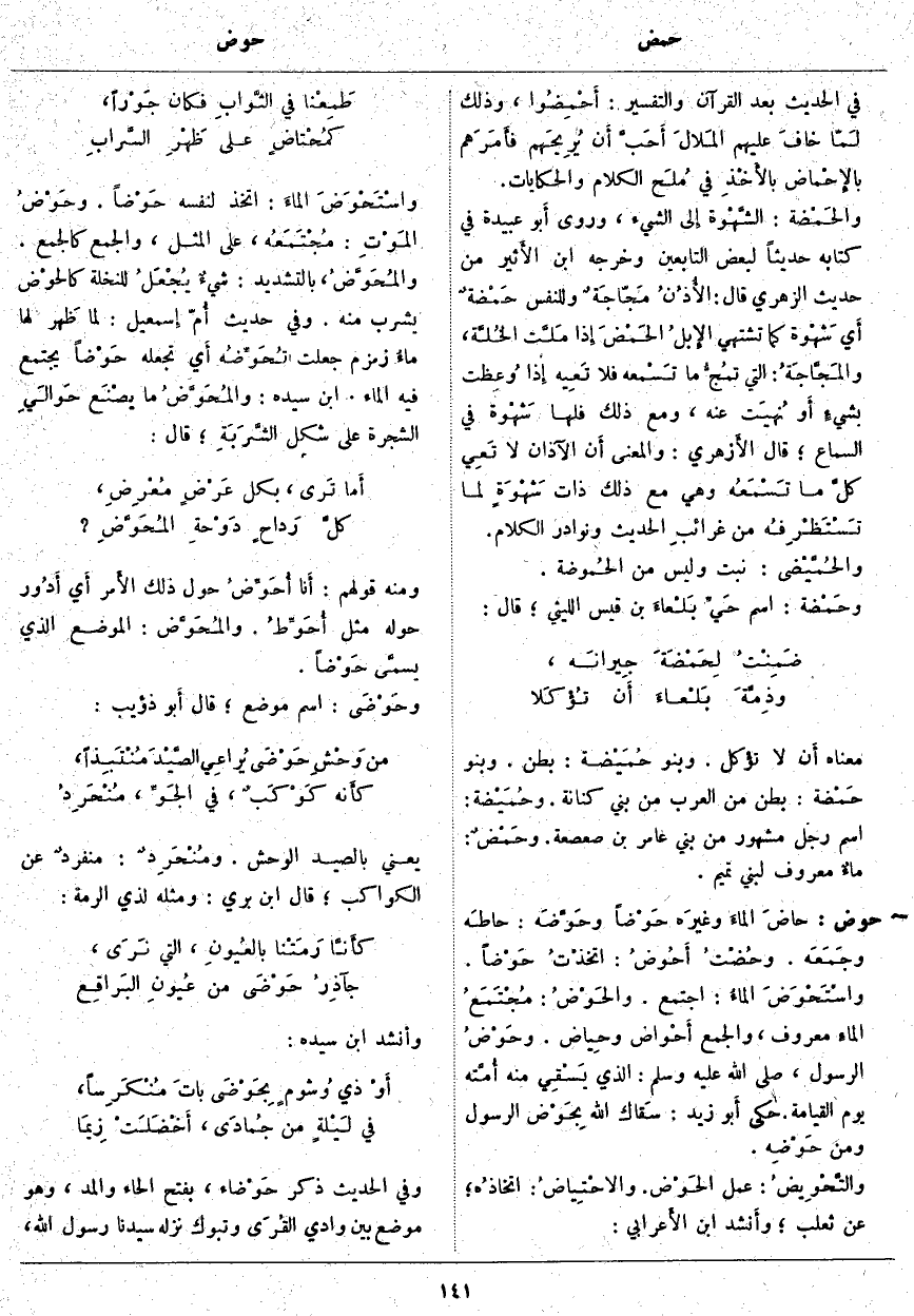 حوض: حاضَ الماءَ وغيرَه حَوْضاً وحَوَّضَه: حاطَه وجَمَعَه. وحُضْتُ أَحُوضُ: اتخذْتُ حَوْضاً. واسْتَحْوَضَ الماءُ: اجْتَمَعَ. والحَوْضُ: مُجْتَمَعُ الْمَاءِ مَعْرُوفٌ، وَالْجَمْعُ أَحْواض وحِيَاض. وحَوْضُ الرَّسُولِ، صَلَّى اللَّهُ عَلَيْهِ وَسَلَّمَ: الَّذِي يَسْقِي مِنْهُ أُمَّته يَوْمَ الْقِيَامَةِ. حَكَى أَبو زَيْدٍ: سَقاك اللَّهُ بِحَوْض الرَّسُولِ وَمِنْ حَوْضِه. والتَّحْوِيضُ: عَمَلُ الحَوْض. والاحْتِياضُ: اتخاذُه؛ عَنْ ثَعْلَبٍ؛ وأَنشد ابْنُ الأَعرابي: