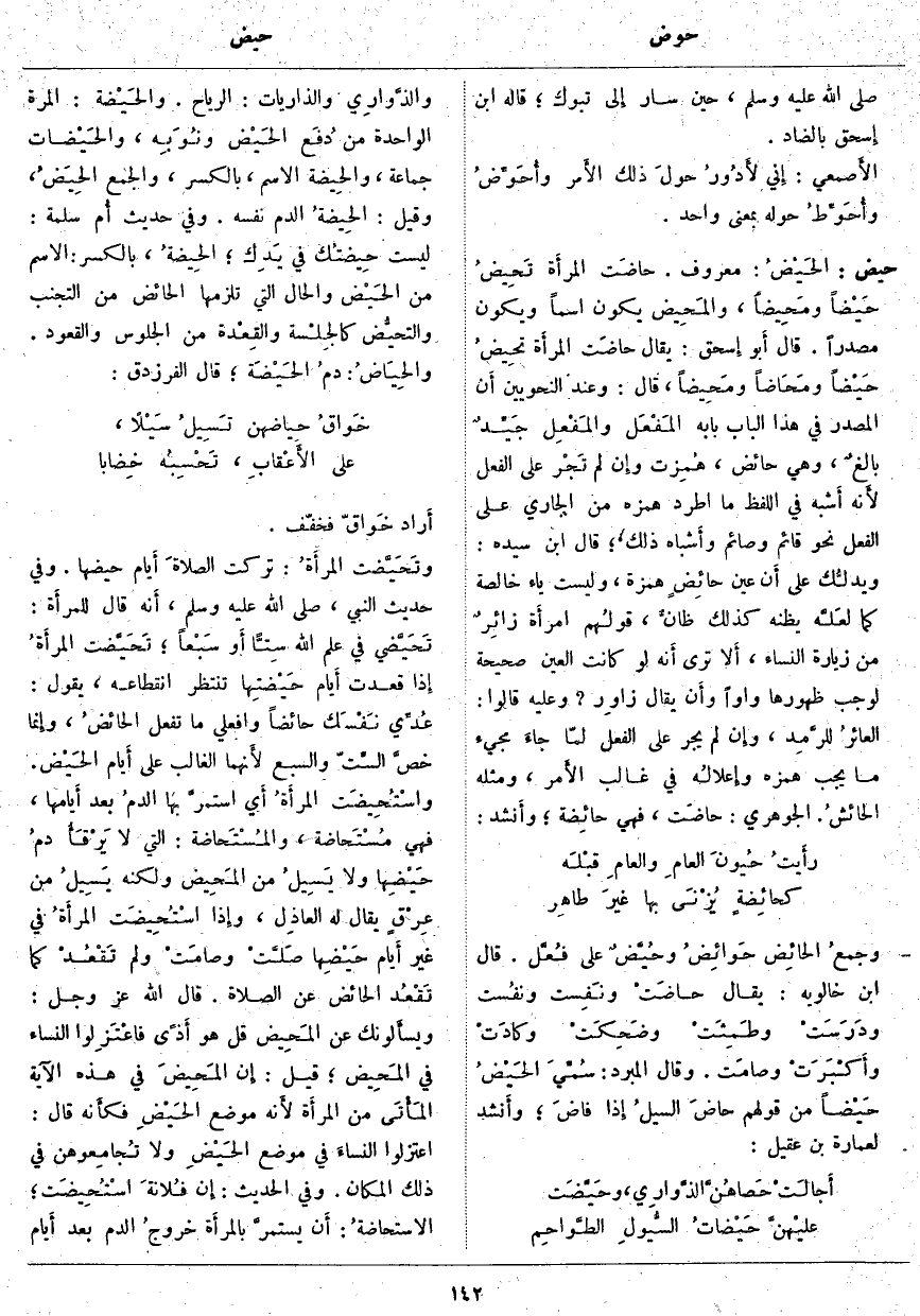 حيض: الحَيْضُ: مَعْرُوفٌ. حَاضَت المرأَة تَحِيضُ حَيْضاً ومَحِيضاً، والمَحِيض يَكُونُ اسْمًا وَيَكُونُ مَصْدَرًا. قَالَ أَبو إِسحاق: يُقَالُ حاضَت المرأَة تحِيضُ حَيْضاً ومَحَاضاً ومَحِيضاً، قَالَ: وَعِنْدَ النَّحْوِيِّينَ أَن الْمَصْدَرَ فِي هَذَا الْبَابِ بَابُهُ المَفْعَل والمَفْعِل جَيِّدٌ بالغٌ، وَهِيَ حَائِض، هُمِزت وإِن لَمْ تَجْر عَلَى الْفِعْلِ لأَنه أَشبه فِي اللَّفْظِ مَا اطَّرَدَ هَمْزُهُ مِنَ الْجَارِي عَلَى الْفِعْلِ نَحْوُ قَائِمٍ وَصَائِمٍ وأَشباه ذَلِكَ؛ قَالَ ابْنُ سِيدَهْ: ويدلُّك عَلَى أَن عَيْنَ حائِضٍ هَمْزَةٌ، وَلَيْسَتْ يَاءً خَالِصَةً كَمَا لعَلَّه يَظُنُّهُ كَذَلِكَ ظانٌّ، قولُهم امرأَة زائِرٌ مِنْ زِيَارَةِ النِّسَاءِ، أَلا تَرَى أَنه لَوْ كَانَتِ الْعَيْنُ صَحِيحَةً لَوَجَبَ ظُهُورُهَا وَاوًا وأَن يُقَالَ زاوِر؟ وَعَلَيْهِ قَالُوا: العائرُ للرَّمِد، وإِن لَمْ يَجْرِ عَلَى الْفِعْلِ لَمَا جاءَ مَجِيءَ مَا يَجِبُ هَمْزُهُ وإِعلالُه فِي غَالِبِ الأَمر، وَمِثْلُهُ الحائشُ. الْجَوْهَرِيُّ: حَاضَتْ، فَهِيَ حَائِضَة؛ وأَنشد: