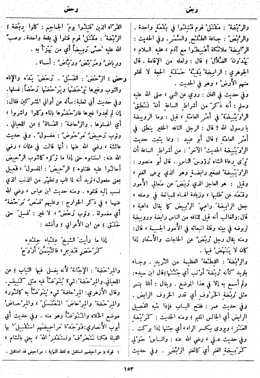؛ قَالَ: وَلَعَلَّهُ مِنَ الإِقامة. قَالَ الْجَوْهَرِيُّ: الرابِضةُ بَقِيَّةُ حَمَلَةِ الْحُجَّةِ لَا تَخْلُو مِنْهُمُ الأَرضُ، وَهُوَ فِي الْحَدِيثِ. وَفِي حَدِيثِ فِي الْفِتَنِ: رُوِيَ عَنِ