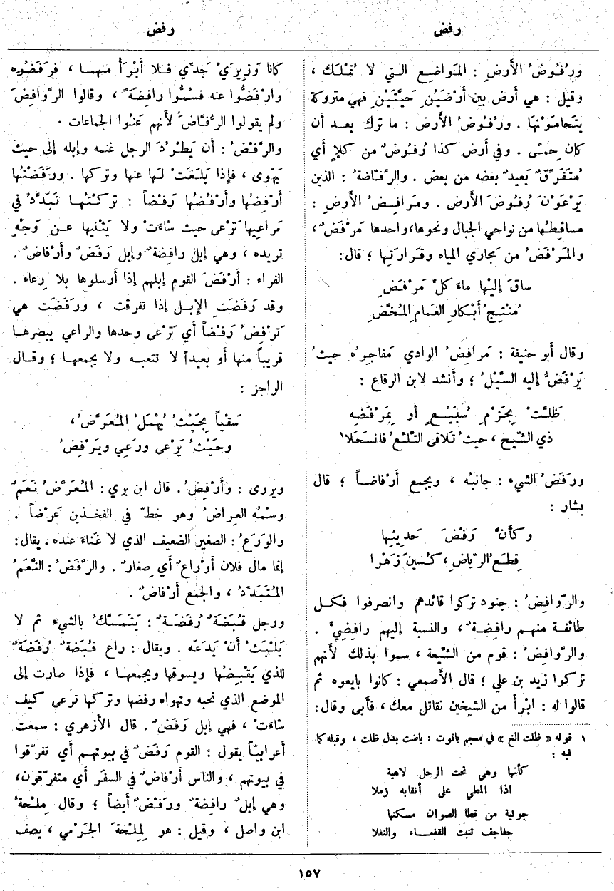 ورُفُوضُ الأَرضِ: المَواضِع الَّتِي لَا تُمْلَك، وَقِيلَ: هِيَ أَرض بَيْنَ أَرْضَيْنِ حَيَّتَيْنِ فَهِيَ مَتْرُوكَةٌ يتَحامَوْنَها. ورُفُوضُ الأَرض: مَا تُرِكَ بَعْدَ أَن كَانَ حِمىً. وَفِي أَرض كَذَا رُفُوضٌ مِنْ كلإٍ أَي مُتَفَرِّقٌ بَعيدٌ بَعْضُهُ مِنْ بَعْضٍ. والرَّفّاضةُ: الَّذِينَ يَرْعَوْنَ رُفُوضَ الأَرض. ومَرافِضُ الأَرضِ: مساقِطُها مِنْ نَوَاحِي الْجِبَالِ وَنَحْوِهَا، وَاحِدُهَا مَرْفَضٌ، والمَرْفَضُ مِنْ مَجاري الْمِيَاهِ وقَرارَتِها؛ قَالَ:
