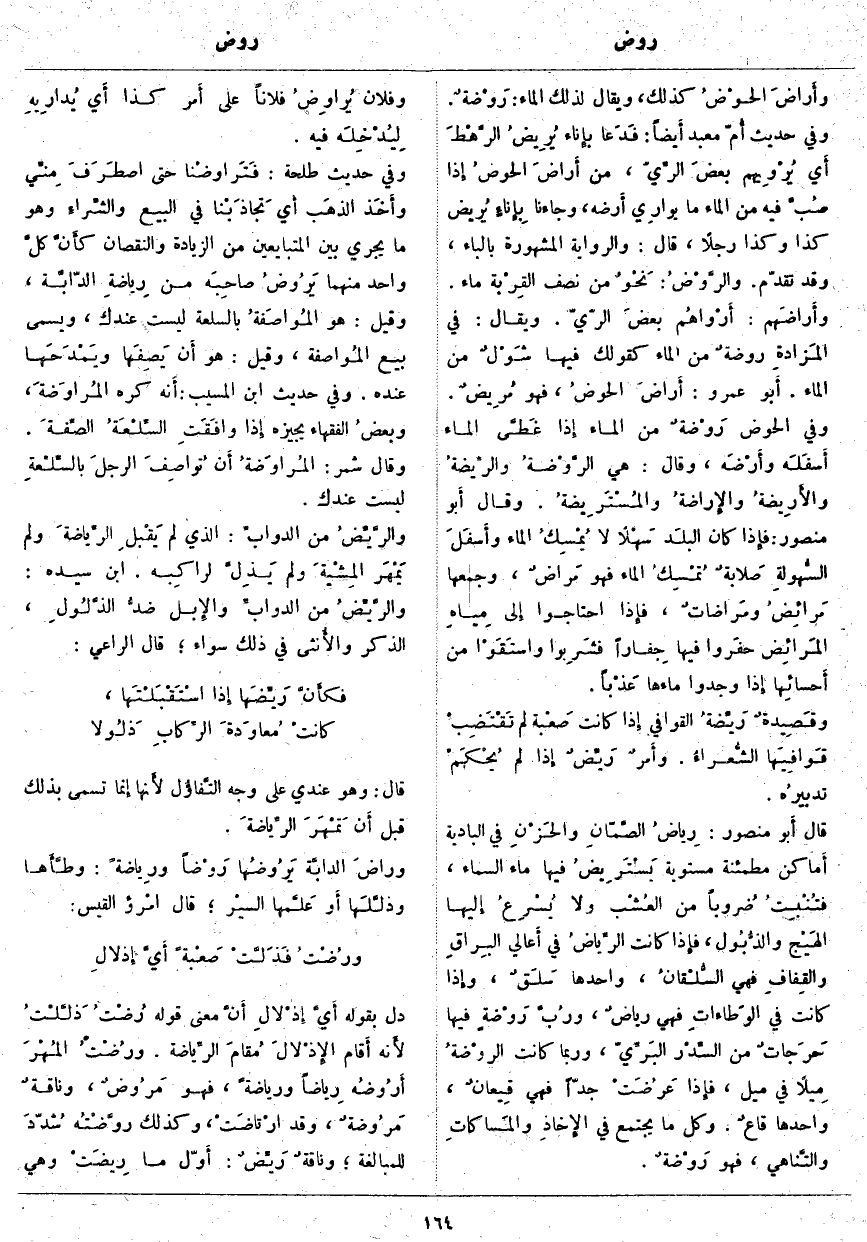 أَي يُرْوِيهم بعضَ الرِّيّ، مِنْ أَراضَ الحوضُ إِذا صُبَّ فِيهِ مِنَ الْمَاءِ مَا يوارِي أَرضه، وَجَاءَنَا بِإِناءٍ يُريضُ كَذَا وَكَذَا رَجُلًا، قَالَ: وَالرِّوَايَةُ الْمَشْهُورَةُ بِالْبَاءِ، وَقَدْ تَقَدَّمَ. والرَّوْضُ: نَحْوٌ مِنْ نَصِفِ القِرْبة مَاءٌ. وأَراضَهم: أَرْواهُم بعضَ الرِّيِّ. وَيُقَالُ: فِي المَزادةِ روضةٌ مِنَ الْمَاءِ كَقَوْلِكَ فِيهَا شَوْلٌ مِنَ الْمَاءِ. أَبو عَمْرٍو: أَراضَ الحوضُ، فَهُوَ مُرِيضٌ. وَفِي الْحَوْضِ رَوْضةٌ مِنَ الْمَاءِ إِذا غَطَّى الْمَاءُ أَسفَلَه وأَرْضَه، وَقَالَ: هِيَ الرَّوْضةُ والرِّيضةُ والأَرِيضةُ والإِراضةُ والمُسْتَرِيضةُ. وَقَالَ أَبو مَنْصُورٍ: فإِذا كَانَ البلَد سَهْلًا لَا يُمْسِكُ الْمَاءَ وأَسفَلَ السُّهولةِ صَلابةٌ تُمْسِكُ الْمَاءَ فَهُوَ مَراضٌ، وَجَمْعُهَا مَرائِضُ ومَراضاتٌ، فإِذا احْتَاجُوا إِلى مِياهِ المَرائِض حفَروا فِيهَا جِفاراً فشَرِبوا واستَقَوْا مِنْ أَحسائِها إِذا وَجَدُوا مَاءَهَا عَذْباً. وقَصِيدةٌ رَيِّضةُ الْقَوَافِي إِذا كَانَتْ صَعْبة لَمْ تَقْتَضِبْ قَوافِيها الشُّعراءُ. وأَمرٌ رَيِّضٌ إِذا لَمْ يُحْكَمْ تدبيرُه. قَالَ أَبو مَنْصُورٍ: رِياضُ الصَّمّانِ والحَزْنِ فِي الْبَادِيَةِ أَماكن مُطْمَئِنَّةٌ مُسْتَوِيَةٌ يَسْتَرِيضُ فِيهَا مَاءُ السَّمَاءِ، فتُنْبِتُ ضُروباً مِنَ العُشْب وَلَا يُسْرِعُ إِليها الهَيْج والذُّبُول، فإِذا كَانَتِ الرِّياضُ فِي أَعالي البِراقِ والقِفافِ فَهِيَ السُّلْقانُ، وَاحِدُهَا سَلَقٌ، وإِذا كَانَتْ فِي الوَطاءاتِ فَهِيَ رياضٌ، ورُبَّ رَوْضةٍ فِيهَا حَرَجاتٌ مِنَ السِّدْر البَرِّيّ، وَرُبَّمَا كَانَتِ الروْضةُ مِيلًا فِي مِيلٍ، فإِذا عَرُضَتْ جِدًّا فَهِيَ قِيعانٌ، وَاحِدُهَا قاعٌ. وَكُلُّ مَا يَجْتَمِعُ فِي الإِخاذِ والمَساكاتِ والتَّناهي، فَهُوَ رَوْضةٌ. وَفُلَانٌ يُراوِضُ فُلَانًا عَلَى أَمر كَذَا أَي يُدارِيهِ لِيُدْخِلَه فِيهِ. وَفِي حَدِيثِ