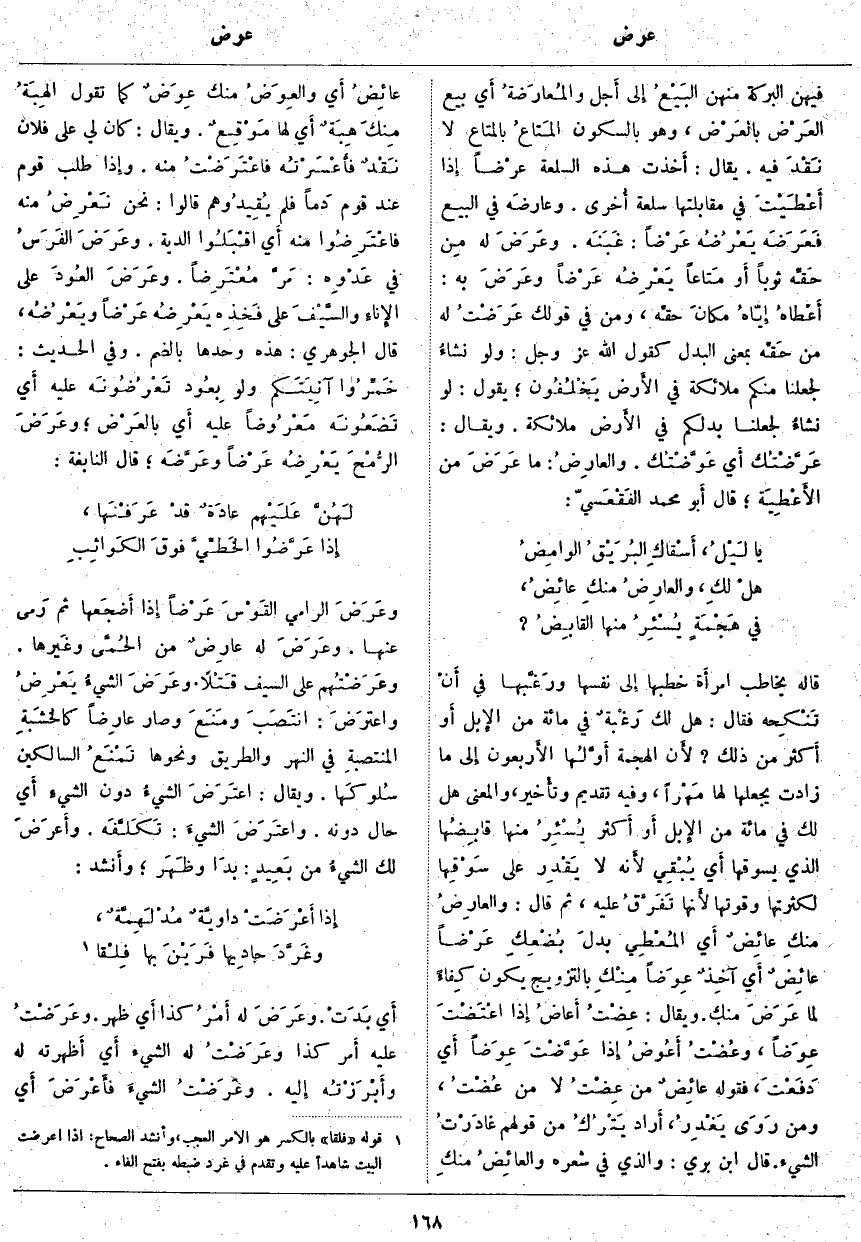 أَي بَيْعُ العَرْض بالعَرْض، وَهُوَ بِالسُّكُونِ المَتاعُ بِالْمَتَاعِ لَا نَقْدَ فِيهِ. يُقَالُ: أَخذت هَذِهِ السِّلْعَةَ عرْضاً إِذا أَعْطَيْتَ فِي مُقَابَلَتِهَا سِلْعَةً أُخرى. وعارضَه فِي الْبَيْعِ فَعَرَضَه يَعْرُضُه عَرْضاً: غَبَنَه. وعَرَضَ لَهُ مِن حقِّه ثَوْبًا أَو مَتاعاً يَعْرِضُه عَرْضاً وعَرَضَ بِهِ: أَعْطاهُ إِيّاهُ مكانَ حقِّه، ومن فِي قَوْلِكِ عَرَضْتُ لَهُ مِنْ حَقِّه بِمَعْنَى الْبَدَلِ كَقَوْلِ اللَّهِ عَزَّ وَجَلَّ: وَلَوْ نَشاءُ لَجَعَلْنا مِنْكُمْ مَلائِكَةً فِي الْأَرْضِ يَخْلُفُونَ؛ يَقُولُ: لَوْ نشاءُ لَجَعَلْنَا بَدَلَكُمْ فِي الأَرض مَلَائِكَةً. وَيُقَالُ: عَرَّضْتُك أَي عَوَّضْتُك. والعارِضُ: مَا عَرَضَ مِنَ الأَعْطِيَة؛ قَالَ أَبو مُحَمَّدٍ الفَقْعَسيّ: