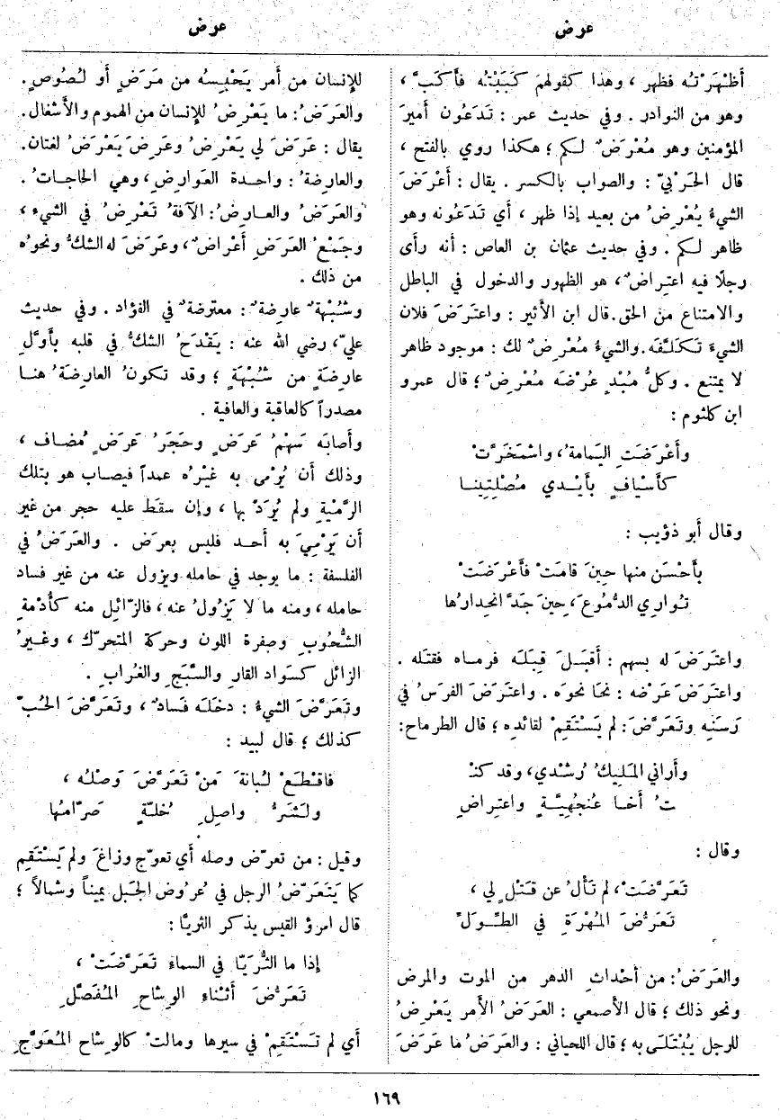 ؛ وَقَدْ تكونُ العارِضَةُ هُنَا مَصْدَرًا كَالْعَاقِبَةِ وَالْعَافِيَةِ. وأَصَابَه سَهْمُ عَرَضٍ وحَجَرُ عَرَضٍ مُضاف، وَذَلِكَ أَن يُرْمى بِهِ غيْرُه عَمْدًا فَيُصَابُ هُوَ بِتِلْكَ الرَّمْيةِ وَلَمْ يُرَدْ بِهَا، وإِن سقَط عَلَيْهِ حَجَرٌ مِنْ غَيْرِ أَن يَرْمِيَ بِهِ أَحد فَلَيْسَ بعرَض. والعَرَضُ فِي الْفَلْسَفَةِ: مَا يُوجَدُ فِي حَامِلِهِ وَيَزُولُ عَنْهُ مِنْ غَيْرِ فَسَادِ حَامِلِهِ، وَمِنْهُ مَا لَا يَزُولُ عَنْهُ، فالزّائِل مِنْهُ كأُدْمةِ الشُّحُوبِ وَصُفْرَةِ اللَّوْنِ وَحَرَكَةِ الْمُتَحَرِّكِ، وغيرُ الزَّائِلِ كسَواد القارِ والسَّبَجِ والغُرابِ. وتَعَرَّضَ الشيءُ: دخَلَه فَسادٌ، وتَعَرَّضَ الحُبّ كَذَلِكَ؛ قَالَ لَبِيدٌ: