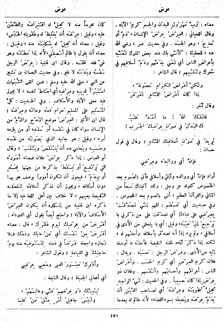 ؛ قَالَ ابْنُ الأَثير: العِرْضُ مَوْضِعُ المَدْحِ والذَّمِّ مِنَ الإِنسان سَوَاءٌ كَانَ فِي نَفْسِه أَو سَلَفِه أَو مَنْ يَلْزَمُهُ أَمره، وَقِيلَ: هُوَ جَانِبُهُ الَّذِي يَصُونُه مِنْ نفْسه وحَسَبِه ويُحامي عَنْهُ أَن يُنْتَقَصَ ويُثْلَبَ، وَقَالَ أَبو الْعَبَّاسِ: إِذا ذُكِرَ عِرْضُ فُلَانٍ فَمَعْنَاهُ أُمُورُه الَّتِي يَرْتَفِعُ أَو يَسْقُطُ بِذِكْرِهَا مِنْ جِهَتِهَا بِحَمْدٍ أَو بِذَمّ، فَيَجُوزُ أَن تَكُونَ أُموراً يُوصَفُ هُوَ بِهَا دُونَ أَسْلافه، وَيَجُوزُ أَن تُذْكَرَ أَسلافُه لِتَلحَقه النّقِيصة بِعَيْبِهِمْ، لَا خِلَافَ بَيْنَ أَهل اللُّغَةِ فِيهِ إِلا مَا ذَكَرَهُ ابْنُ قُتَيْبَةَ مِنْ إِنكاره أَن يَكُونَ العِرْضُ الأَسْلافَ والآباءَ؛ وَاحْتَجَّ أَيضاً بِقَوْلِ أَبي الدَّرْدَاءِ: أَقْرِضْ مِنْ عِرْضِك لِيَوْمِ فَقْرِك، قَالَ: مَعْنَاهُ أَقْرِضْ مِنْ نَفْسِك أَي مَنْ عَابَكَ وَذَمَّكَ فَلَا تُجازه وَاجْعَلْهُ قَرْضاً فِي ذِمَّتِهِ لِتَسْتَوفِيَه مِنْهُ يومَ حاجتِكَ فِي القِيامةِ؛ وَقَوْلُ الشَّاعِرِ:
