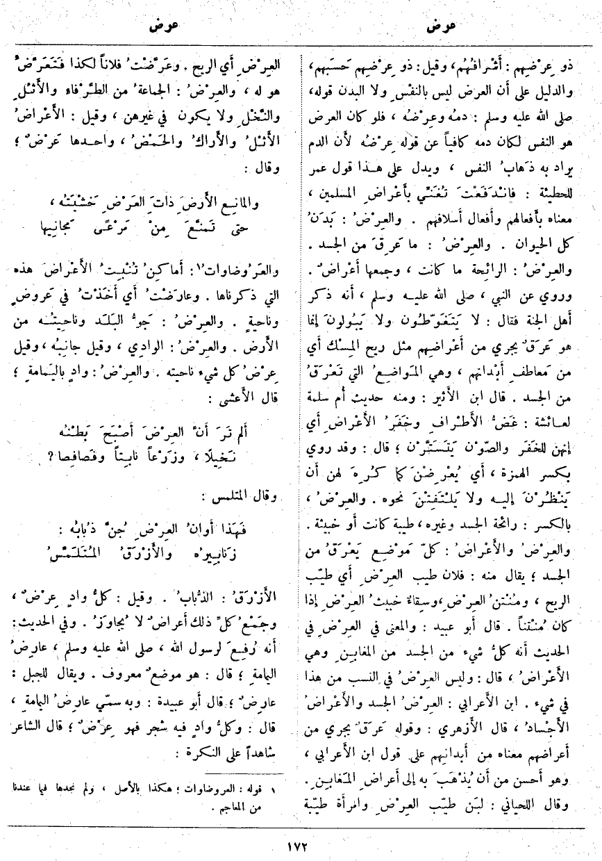والعَرُوضاواتُ «3»: أَماكِنُ تُنْبِتُ الأَعْراضَ هَذِهِ الَّتِي ذَكَرْنَاهَا. وعارَضْتُ أَي أَخَذْتُ فِي عَروضٍ وناحيةٍ. والعِرْضُ: جَوُّ البَلَد وناحِيتُه مِنَ الأَرض. والعِرْضُ: الوادِي، وَقِيلَ جانِبُه، وَقِيلَ عِرْضُ كُلِّ شَيْءٍ نَاحِيَتُهُ. والعِرْضُ: وادٍ باليَمامةِ؛ قَالَ الأَعشى: