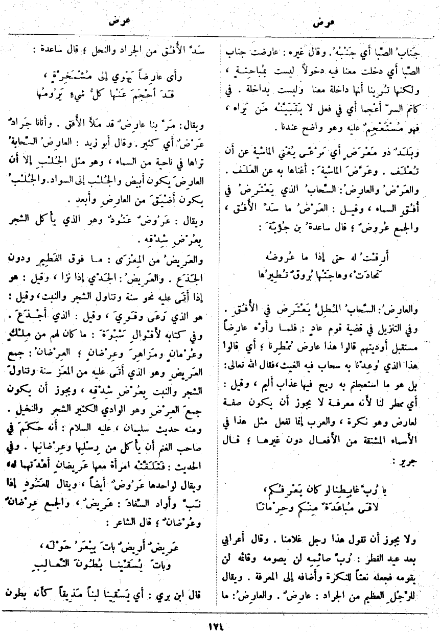 وَيُقَالُ: مَرَّ بِنَا عارِضٌ قَدْ مَلأَ الأُفق. وأَتانا جَرادٌ عَرْضٌ أَي كَثِيرٌ. وَقَالَ أَبو زَيْدٍ: العارِضُ السَّحابةُ تَرَاهَا فِي نَاحِيَةٍ مِنَ السَّمَاءِ، وَهُوَ مِثْلُ الجُلْبِ إِلا أَن العارِضَ يَكُونُ أَبيض والجُلْب إِلى السَّوَادِ. والجُلْبُ يَكُونُ أَضْيَقَ مِنَ العارِضِ وأَبعد. وَيُقَالُ: عَرُوضٌ عَتُودٌ وهو الَّذِي يأْكل الشَّجَرَ بِعُرْضِ شِدْقِه. والعَرِيضُ مِنَ المِعْزَى: مَا فَوْقَ الفَطِيمِ وَدُونَ الجَذَع. والعَرِيضُ: الجَدْي إِذا نَزَا، وَقِيلَ: هُوَ إِذا أَتَى عَلَيْهِ نَحْوُ سَنَةٍ وَتَنَاوُلَ الشَّجَرَ وَالنَّبْتَ، وَقِيلَ: هُوَ الَّذِي رَعَى وقَوِيَ، وَقِيلَ: الَّذِي أَجْذَعَ. وَفِي كِتَابِهِ لأَقْوالِ شَبْوَةَ: مَا كَانَ لَهُمْ مِنْ مِلْكٍ وعُرْمانٍ ومَزاهِرَ وعِرْضانٍ؛ العِرْضانُ: جَمْعُ العَرِيضِ وَهُوَ الَّذِي أَتَى عَلَيْهِ مِنَ المعَز سنة وتناولَ الشجر والنبت بِعُرْضِ شِدْقِه، وَيَجُوزُ أَن يَكُونَ جمعَ العِرْضِ وَهُوَ الْوَادِي الْكَثِيرِ الشَّجَرِ وَالنَّخِيلِ. وَمِنْهُ حَدِيثِ