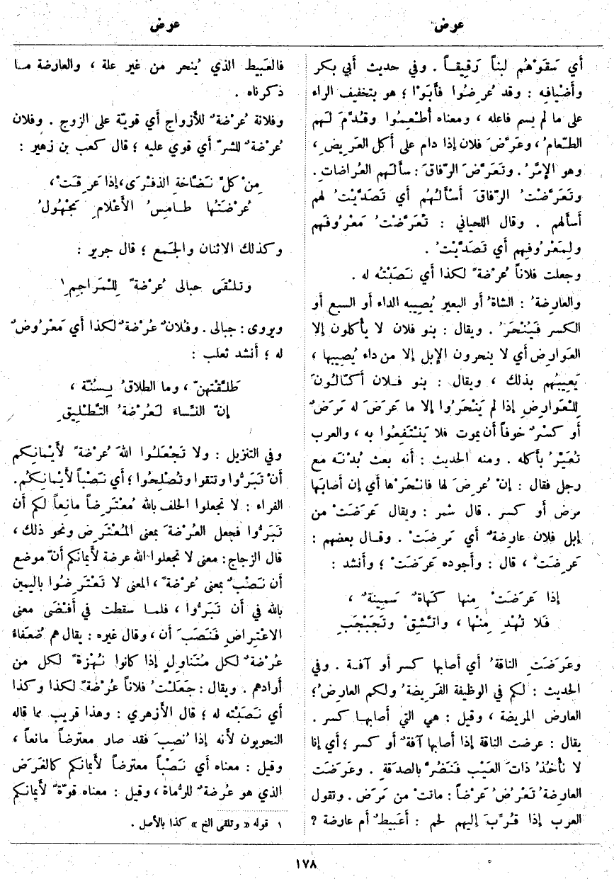 ؛ هُوَ بِتَخْفِيفِ الرَّاءِ عَلَى مَا لَمْ يُسَمَّ فَاعِلُهُ، وَمَعْنَاهُ أُطْعِمُوا وقُدِّمَ لَهم الطّعامُ، وعَرَّضَ فُلَانٌ إِذا دَامَ عَلَى أَكل العَرِيضِ، وَهُوَ الإِمَّرُ. وتَعَرَّضَ الرّفاقَ: سأَلَهم العُراضاتِ. وتَعَرَّضْتُ الرّفاقَ أَسْأَلُهُم أَي تَصَدَّيْتُ لَهُمْ أَسأَلهم. وَقَالَ اللِّحْيَانِيُّ: تَعَرَّضْتُ مَعْروفَهم ولِمَعْرُوفِهم أَي تَصَدَّيْتُ. وَجَعَلْتُ فُلَانًا عُرْضةً لِكَذَا أَي نَصَبْتُه لَهُ. والعارِضةُ: الشاةُ أَو الْبَعِيرُ يُصِيبه الدَّاءُ أَو السَّبُعُ أَو الْكَسْرُ فَيُنْحَرُ. وَيُقَالُ: بَنُو فُلَانٍ لَا يأْكلون إِلا العَوارِض أَي لَا يَنْحَرُونَ الإِبل إِلا مِنْ دَاءٍ يُصِيبها، يَعِيبُهم بِذَلِكَ، وَيُقَالُ: بَنُو فُلَانٍ أَكَّالُونَ لِلْعَوارِضِ إِذا لَمْ يَنْحَرُوا إِلا مَا عَرَضَ لَهُ مَرَضٌ أَو كسْرٌ خَوْفًا أَن يَمُوتَ فَلَا يَنْتَفِعُوا بِهِ، وَالْعَرَبُ تُعَيِّرُ بأَكله. وَمِنْهُ الْحَدِيثُ: