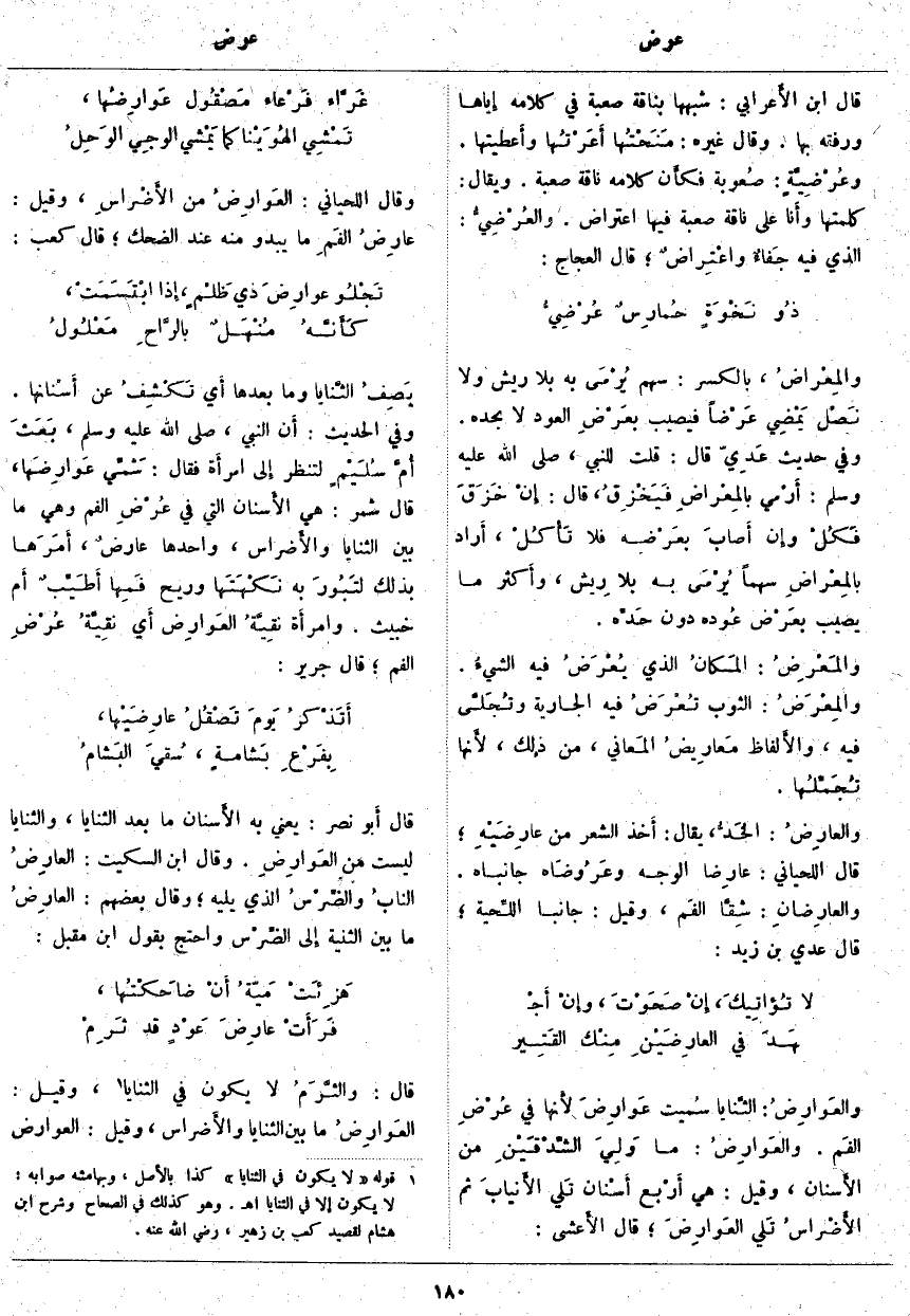 قَالَ أَبو نَصْرٍ: يَعْنِي بِهِ الأَسنان مَا بَعْدَ الثَّنَايَا، وَالثَّنَايَا لَيْسَتْ مِنَ العَوارِضِ. وَقَالَ ابْنُ السِّكِّيتِ: العارِضُ النابُ والضِّرْسُ الَّذِي يَلِيهِ؛ وَقَالَ بَعْضُهُمُ: العارِضُ مَا بَيْنَ الثَّنِيَّةِ إِلى الضِّرْس وَاحْتَجَّ بِقَوْلِ ابْنِ مُقْبِلٍ: