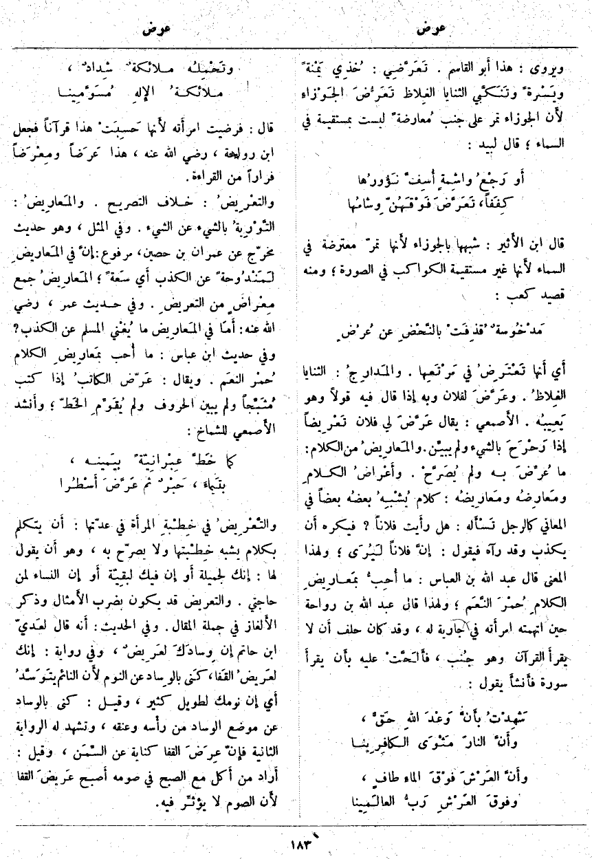 قَالَ: فَرَضِيَتِ امرأَته لأَنها حَسِبَتْ هَذَا قُرْآنًا فَجَعَلَ ابْنُ رَوَاحَةَ، رَضِيَ اللَّهُ عَنْهُ، هَذَا عَرَضاً ومِعْرَضاً فِرَارًا مِنَ الْقِرَاءَةِ. والتعْرِيضُ: خِلَافُ التَّصْرِيحِ. والمَعارِيضُ: التَّوْرِيةُ بِالشَّيْءِ عَنِ الشَّيْءِ. وَفِي الْمَثَلِ، وَهُوَ حَدِيثٌ مُخَرَّجٌ عَنْ