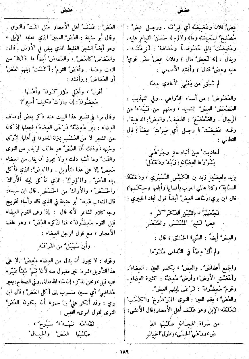 وَقَالَ مَرَّةً فِي تَفْسِيرِ هَذَا الْبَيْتِ عِنْدَ ذِكْرِ بَعْضِ أَوصاف العِضاه: إِبل مُعِضَّةٌ تَرْعَى العِضاهَ، فَجَعَلَهَا إِذ كَانَ مِنَ الشَّجَرِ لَا مِنَ العُشْبِ بِمَنْزِلَةِ الْمَعْلُوفَةِ فِي أَهلها النَّوَى وَشَبَهَهُ، وَذَلِكَ أَن العُضَّ هُوَ علَف الرِّيفِ مِنَ النَّوَى والقَتِّ وَمَا أَشبه ذَلِكَ، وَلَا يَجُوزُ أَن يُقَالَ مِنَ العِضاه مُعِضٌّ إِلا عَلَى هَذَا التأْويل. والمُعِضُّ: الَّذِي تأْكل إِبله العُضَّ. والمُؤْرِكُ: الَّذِي تأْكل إِبله الأَراكَ والحَمْضَ، والأَراكُ مِنَ الحَمْضِ. قَالَ ابْنُ سِيدَهْ: قَالَ الْمُتَعَقِّبُ غَلِطَ أَبو حَنِيفَةَ فِي الَّذِي قَالَهُ وأَساءَ تَخْرِيجَ وَجْهِ كَلَامِ الشَّاعِرِ لأَنه قَالَ: إِذا رَعَى الْقَوْمُ العِضاه قِيلَ الْقَوْمُ مُعِضُّونَ، فَمَا لِذِكْرِهِ العُضّ، وَهُوَ عَلَفُ الأَمصار، مَعَ قَوْلِ الرَّجُلِ العِضاه: