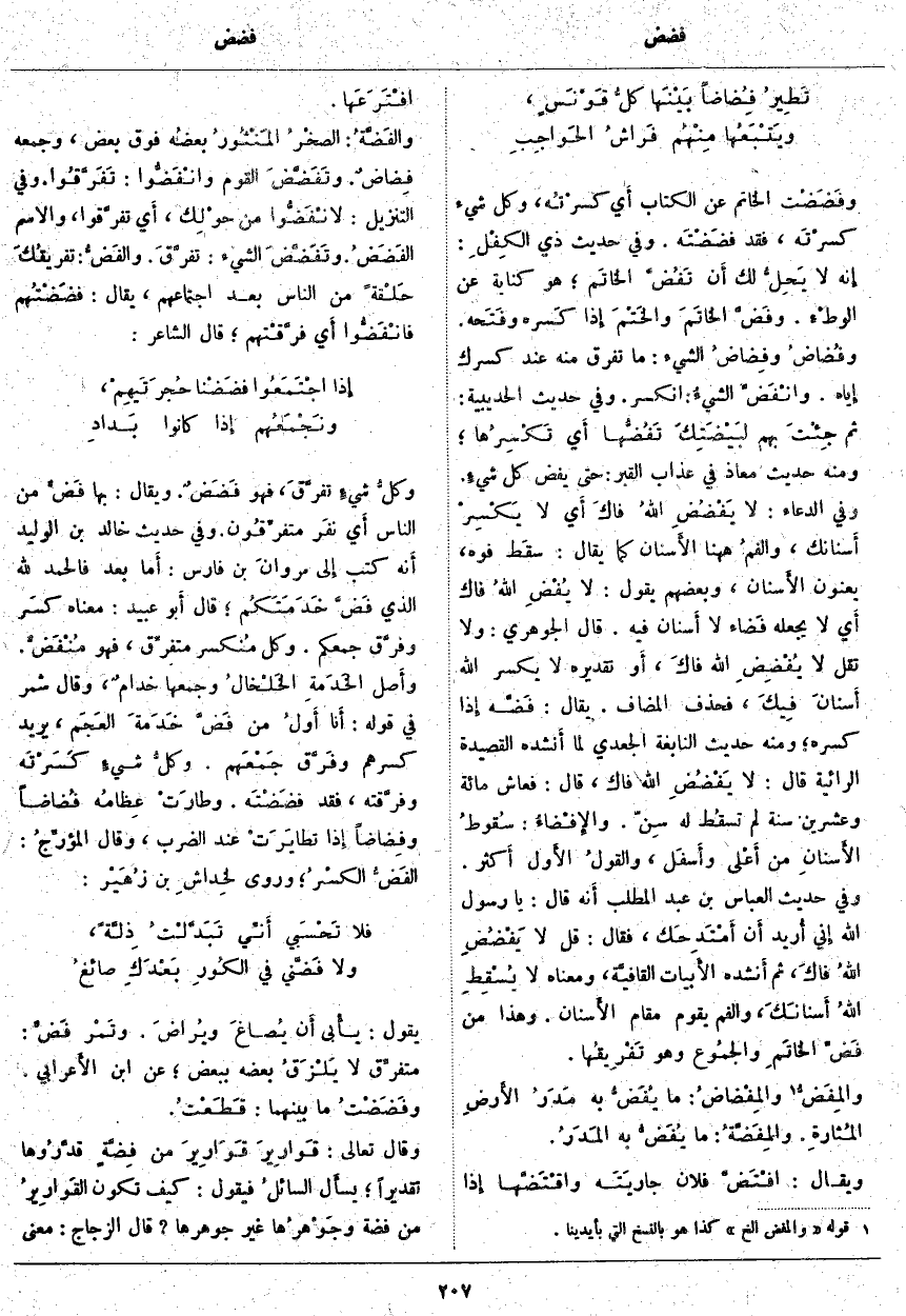 ، وَمَعْنَاهُ لَا يُسْقِطِ اللهُ أَسنانَكَ، وَالْفَمُ يَقُومُ مَقَامَ الأَسنان. وَهَذَا مِنْ فَضِّ الخاتَمِ والجمُوع وَهُوَ تَفْريقُها. والمِفَضُّ «1» والمِفْضاضُ: مَا يُفَضُّ به مَدَرُ الأَرصِ المُثارةِ. والمِفَضَّةُ: مَا يُفَضُّ بِهِ المَدَرُ. وَيُقَالُ: افْتَضَّ فُلَانٌ جاريَتَه واقْتَضَّها إِذا افْتَرَعَها. والفَضَّةُ: الصخْرُ المَنْثُورُ بعضُه فَوْقَ بَعْضٍ، وَجَمْعُهُ فِضاضٌ. وتَفَضَّضَ الْقَوْمُ وانْفَضُّوا: تَفَرَّقُوا. وَفِي التَّنْزِيلِ: لَانْفَضُّوا مِنْ حَوْلِكَ
