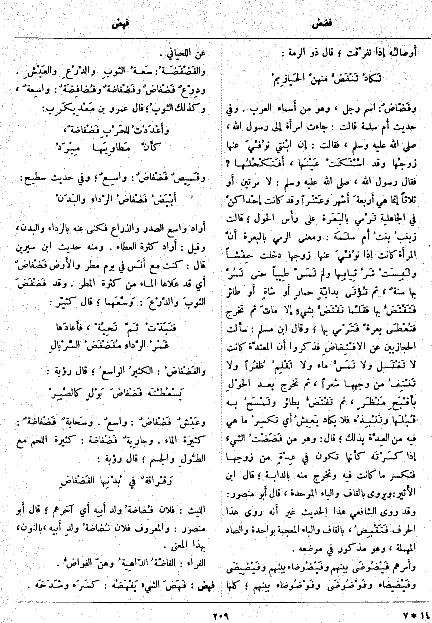 ؛ قَالَتْ زينبُ بنتُ أُم سلَمَة: وَمَعْنَى الرَّمْيِ بِالْبَعَرَةِ أَنَّ المرأَة كَانَتْ إِذا توُفِّيَ عَنْهَا زَوْجُهَا دَخَلَتْ حِفْشاً ولَبِسَتْ شَرَّ ثِيابِها وَلَمْ تَمَسَّ طِيباً حَتَّى تَمُرَّ بِهَا سنةٌ، ثُمَّ تُؤْتَى بدابّةٍ حمارٍ أَو شاةٍ أَو طَائِرٍ فَتَفْتَضُّ بِهَا فقَلَّما تَفْتَضُّ بشيءٍ إِلا ماتَ ثُمَّ تَخْرُجُ فتُعْطَى بَعَرَةً فَتَرْمي بِهَا؛ وَقَالَ ابْنُ مُسْلِمٍ: سأَلت الْحِجَازِيِّينَ عَنِ الافْتِضاضِ فَذَكَرُوا أَن المعتدَّة كَانَتْ لَا تَغْتَسِل وَلَا تَمَسُّ مَاءً وَلَا تَقْلِمُ ظُفُراً وَلَا تَنْتِفُ مِنْ وَجْهِهَا شَعَرًا، ثُمَّ تَخْرُجُ بَعْدَ الحوْلِ بأَقْبَحِ مَنْظَرٍ، ثُمَّ تَفْتَضُّ بِطَائِرٍ وتَمْسَحُ بِهِ قُبُلَها وتَنْبِذُه فَلَا يَكَادُ يَعِيشُ أَي تكسِرُ مَا هِيَ فِيهِ مِنَ العِدَّة بِذَلِكَ؛ قَالَ: وَهُوَ مِنْ فَضَضْتُ الشيءَ إِذا كسَرْتَه كأَنها تَكُونُ فِي عِدَّةٍ مِنْ زَوْجِهَا فَتَكْسِرُ مَا كَانَتْ فِيهِ وَتَخْرُجُ مِنْهُ بِالدَّابَّةِ؛ قَالَ ابْنُ الأَثير: وَيُرْوَى بِالْقَافِ وَالْبَاءِ الْمُوَحَّدَةِ، قَالَ أَبو مَنْصُورٍ: وَقَدْ رَوَى الشَّافِعِيُّ هَذَا الْحَدِيثَ غَيْرَ أَنه رَوَى هَذَا الْحَرْفَ فَتَقْبِصُ، بِالْقَافِ وَالْبَاءِ الْمُعْجَمَةِ بِوَاحِدَةٍ وَالصَّادِ الْمُهْمَلَةِ، وَهُوَ مَذْكُورٌ فِي مَوْضِعِهِ. وأَمرهم فَيْضُوضَى بَيْنَهُمْ وفَيْضُوضاء بَيْنَهُمْ وفَيْضِيضَى وفَيْضيضاء وفَوْضُوضَى وفَوْضُوضاء بَيْنَهُمْ؛ كُلُّهَا عَنِ اللِّحْيَانِيِّ. والفَضْفَضَةُ: سَعةُ الثوبِ والدِّرْعِ والعَيْشِ. ودِرْعٌ فَضْفاضٌ وفَضْفاضةٌ وفُضافِضَةٌ: واسِعةٌ، وَكَذَلِكَ الثوبُ؛ قَالَ عَمْرُو بْنُ مَعْدِيكَرِب: