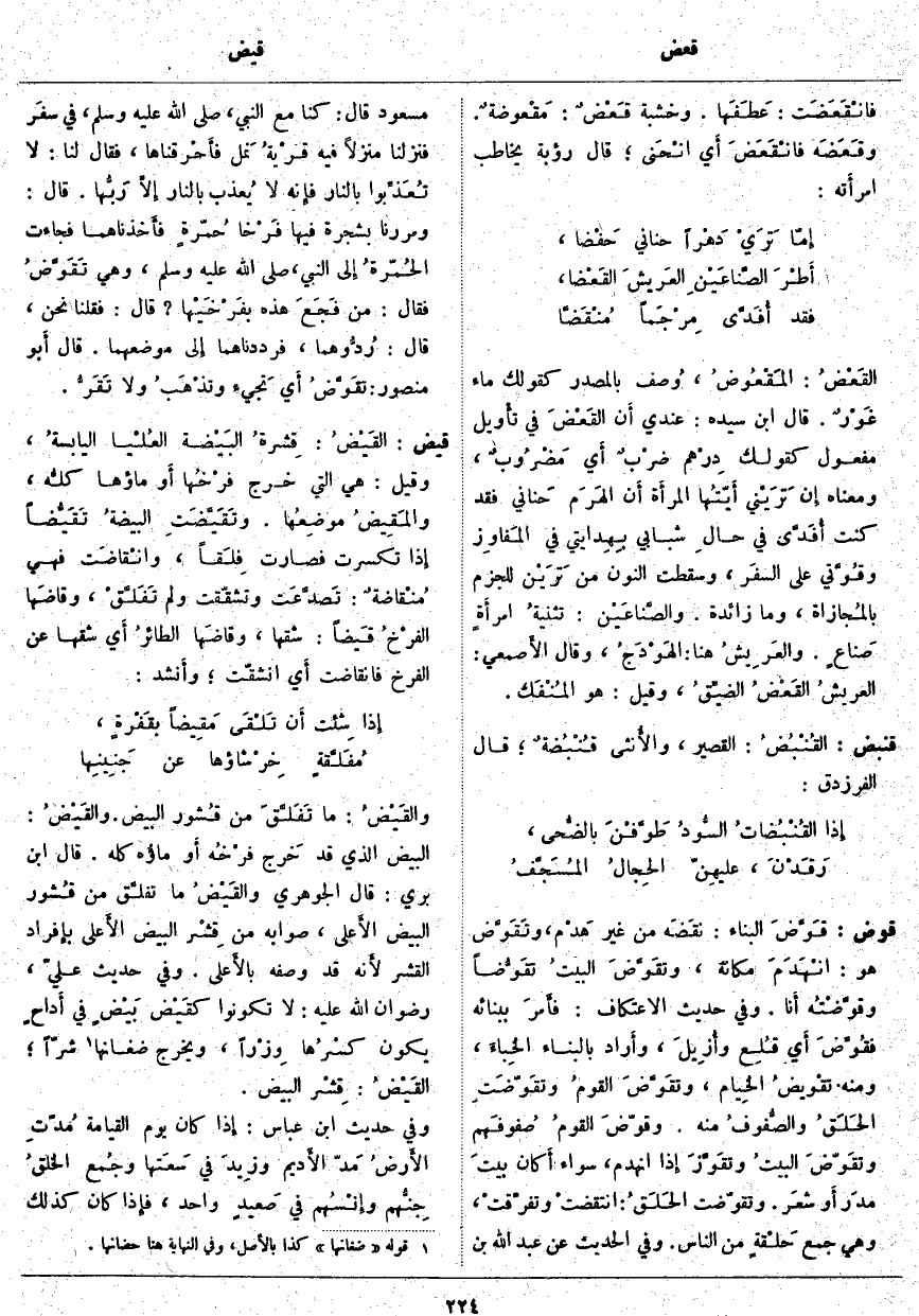 قيض: القَيْضُ: قِشرةُ البَيْضة العُلْيا اليابسةُ، وَقِيلَ: هِيَ الَّتِي خَرَجَ فرْخُها أَو مَاؤُهَا كلُّه، والمَقِيضُ موضِعُها. وتَقَيَّضَتِ البيضةُ تَقَيُّضاً إِذا تَكَسَّرَتْ فَصَارَتْ فِلَقاً، وانْقاضَت فَهِيَ مُنْقاضةٌ: تَصدَّعَت وتشقَّقت وَلَمْ تَفَلَّقْ، وقاضَها الفرْخُ قَيضاً: شَقَّهَا، وقاضَها الطائرُ أَي شَقَّهَا عَنِ الْفَرْخِ فَانْقَاضَتْ أَي انْشَقَّتْ؛ وأَنشد: