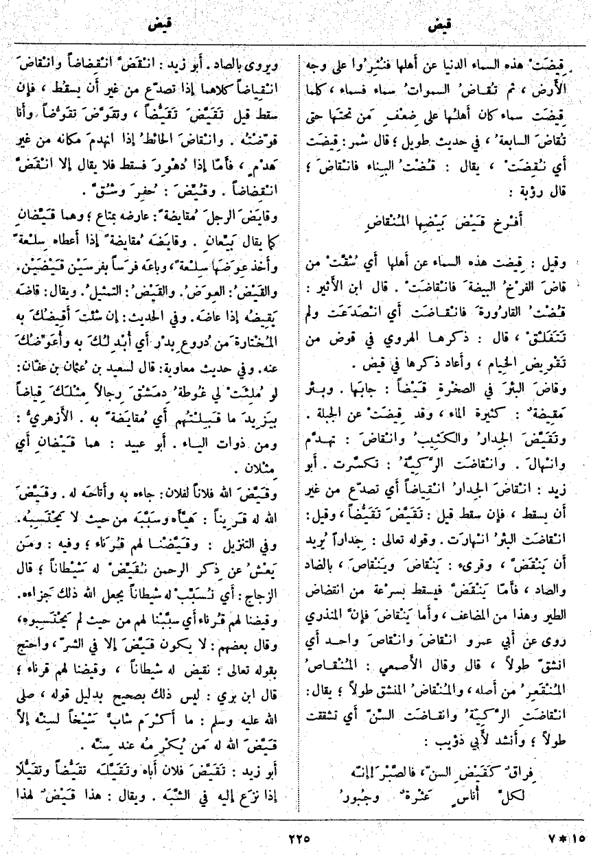 وَيُرْوَى بِالصَّادِ. أَبو زَيْدٍ: انْقَضَّ انْقِضاضاً وانْقاضَ انْقِياضاً كِلَاهُمَا إِذا تَصَدَّعَ مِنْ غَيْرِ أَن يسقُط، فإِن سَقَطَ قِيلَ تَقَيَّضَ تَقَيُّضاً، وتقَوَّضَ تقَوُّضاً وأَنا قوّضْتُه. وانْقاضَ الحائطُ إِذا انهدمَ مَكَانَهُ مِنْ غَيْرِ هَدْمٍ، فأَمّا إِذا دُهْوِرَ فَسَقَطَ فَلَا يُقَالُ إِلا انْقَضَّ انْقِضاضاً. وقُيِّضَ: حُفِرَ وشُقَّ. وقايَضَ الرجلَ مُقايضةً: عَارَضَهُ بِمَتَاعٍ؛ وَهُمَا قَيِّضانِ كَمَا يُقَالُ بَيِّعانِ. وقايَضَهُ مُقايضةً إِذا أَعطاه سِلْعةً وأَخذ عِوَضَها سِلْعةً، وباعَه فرَساً بفرسَيْن قَيْضَيْن. والقَيْضُ: العِوَضُ. والقَيْضُ: التمثيلُ. وَيُقَالُ: قاضَه يَقِيضُه إِذا عاضَه. وَفِي الْحَدِيثِ: