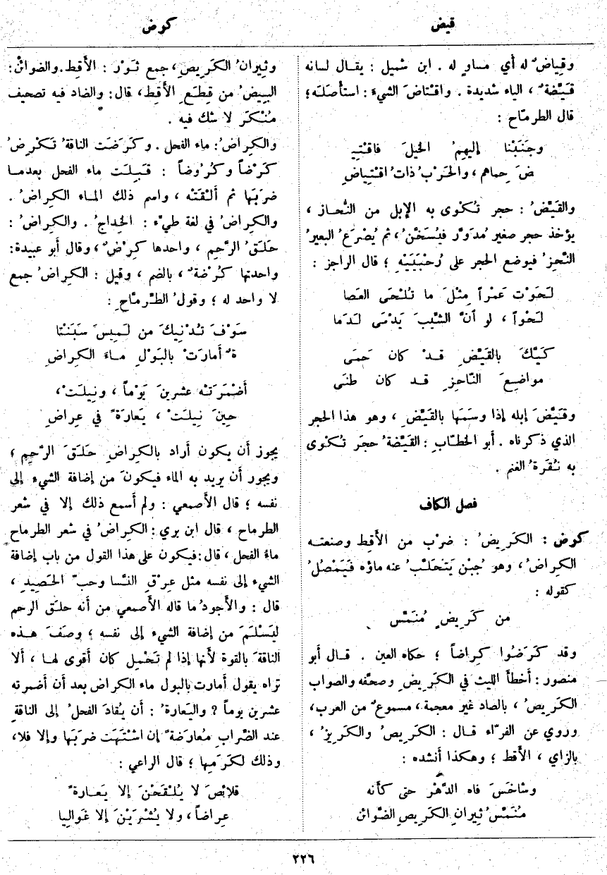 وثِيرانُ الكَرِيصِ؛ جَمْعُ ثَوْر: الأَقِط. وَالضَّوَائِنُ: البِيضُ مِنْ قِطَعِ الأَقِط، قَالَ: وَالضَّادُ فِيهِ تَصْحِيفٌ مُنْكَر لَا شَكَّ فِيهِ. والكِراضُ: مَاءُ الْفَحْلِ. وكَرَضَت الناقةُ تَكْرِضُ كَرْضاً وكُرُوضاً: قَبِلَت ماء الفحل بعد ما ضرَبَها ثُمَّ أَلْقَتْه، وَاسْمُ ذَلِكَ الْمَاءِ الكِراضُ. والكِراضُ فِي لُغَةِ طيِء: الخِداجُ. والكِراضُ: حَلَقُ الرَّحِم، وَاحِدُهَا كِرْضٌ، وَقَالَ أَبو عُبَيْدَةَ: وَاحِدَتُهَا كُرْضةٌ، بِالضَّمِّ، وَقِيلَ: الكِراضُ جَمْعٌ لَا وَاحِدَ لَهُ؛ وقولُ الطِّرمَّاحِ: