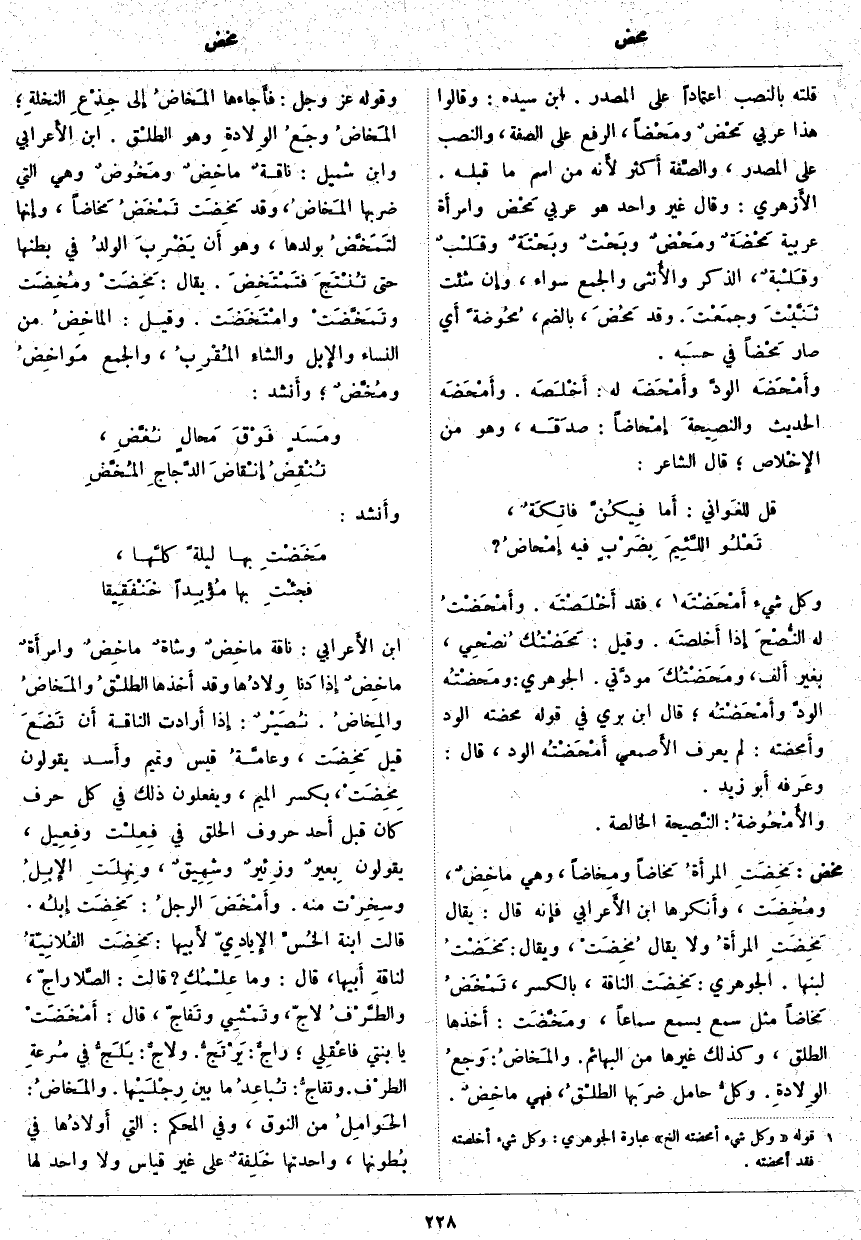 ابْنُ الأَعرابي: نَاقَةٌ ماخِضٌ وشاةٌ ماخِضٌ وامرأَةٌ ماخِضٌ إِذا دَنا وِلادُها وَقَدْ أَخذها الطلْقُ والمَخاضُ والمِخاضُ. نُصَيْرٌ: إِذا أَرادت النَّاقَةُ أَن تَضَعَ قِيلَ مَخِضَت، وعامَّةُ قَيْسٍ وَتَمِيمٍ وأَسد يَقُولُونَ مِخِضَتْ، بِكَسْرِ الْمِيمِ، وَيَفْعَلُونَ ذَلِكَ فِي كُلِّ حَرْفٍ كَانَ قَبْلَ أَحد حُرُوفِ الْحَلْقِ فِي فِعِلْت وفِعِيل، يَقُولُونَ بِعيرٌ وزِئيرٌ وشِهِيقٌ، ونِهِلَتِ الإِبِلُ وسِخِرْت مِنْهُ. وأَمْخَضَ الرجلُ: مَخِضَت إِبلُه. قَالَتِ ابْنَةُ الخُسِّ الإِيادِيّ لأَبيها: مَخِضَت الفُلانِيّةُ لناقةِ أَبيها، قَالَ: وَمَا عِلْمُكِ؟ قَالَتْ: الصَّلا رَاجٌّ، والطَّرْفُ لَاجٌّ، وتَمْشِي وتَفاجّ، قَالَ: أَمْخَضَتْ يَا بِنْتِي فاعْقِلي؛ راجٌّ: يَرْتَجُّ. ولاجٌّ: يَلَجُّ فِي سُرعةِ الطرْف. وتفاجُّ: تُباعِدُ مَا بَيْنَ رِجْلَيْها. والمَخاضُ: الحَوامِلُ مِنَ النُّوقِ، وَفِي الْمُحْكَمِ: الَّتِي أَولادُها فِي بُطونها، وَاحِدَتُهَا خَلِفةٌ عَلَى غَيْرِ قِيَاسٍ وَلَا وَاحِدَ لَهَا