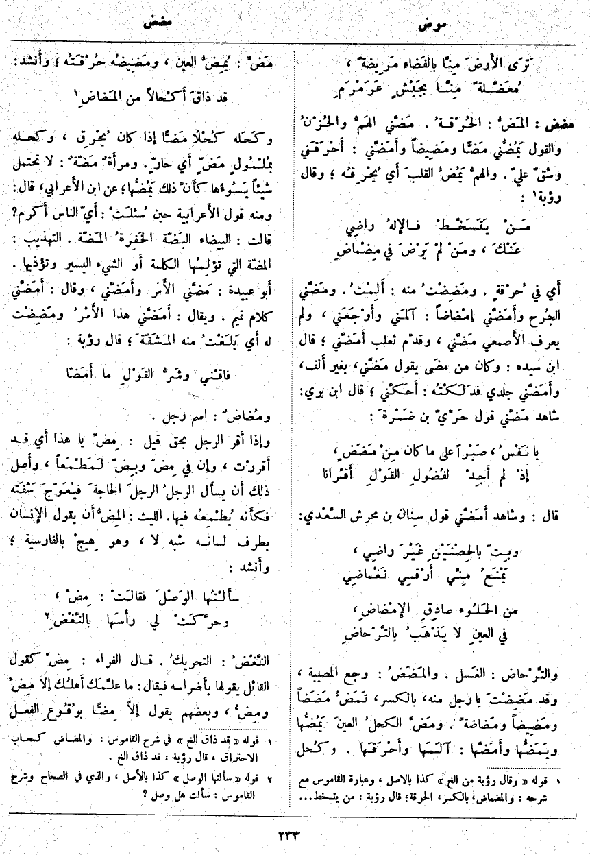 مضض: المَضُّ: الحُرْقةُ. مَضَّني الهَمُّ والحُزْنُ وَالْقَوْلُ يَمُضُّني مَضّاً ومَضِيضاً وأَمَضَّني: أَحْرَقَني وَشَقَّ عَلَيَّ. والهمُّ يَمُضُّ القلبَ أَي يُحْرِقُه؛ وَقَالَ رُؤْبَةُ «1»: