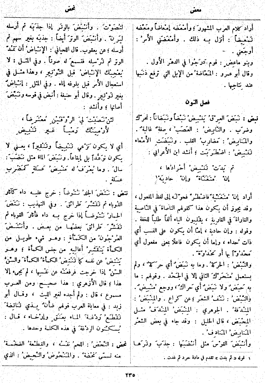 نبض: نَبَضَ العِرْقُ يَنْبِضُ نَبْضاً ونَبَضاناً: تَحَرَّكَ وضرَب. والنّابِضُ: العَصَبُ، صِفةٌ غالبةٌ. والمَنابِضُ: مَضارِبُ الْقَلْبِ. ونَبَضَتِ الأَمْعاء تَنْبِضُ: اضْطَرَبَت؛ أَنشد ابْنُ الأَعرابي: