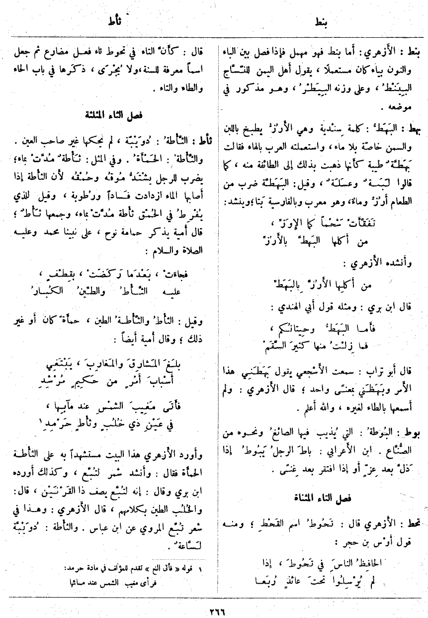 بهط: البَهَطُّ: كَلِمَةٌ سِنْدية وَهِيَ الأَرُزُّ يُطْبَخُ بِاللَّبَنِ وَالسَّمْنِ خَاصَّةً بِلَا مَاءٍ، وَاسْتَعْمَلَتْهُ الْعَرَبُ بِالْهَاءِ فَقَالَتْ بَهَطَّةٌ طَيِّبَةٌ كأَنها ذَهَبَتْ بِذَلِكَ إِلى الطَّائِفَةِ مِنْهُ، كَمَا قَالُوا لَبَنَةٌ وعسَلَةٌ، وَقِيلَ: البَهَطَّة ضَرْبٌ مِنَ الطَّعَامِ أَرُزٌّ وماءٌ، وَهُوَ مُعَرَّبٌ وَبِالْفَارِسِيَّةِ بَتا؛ وَيُنْشَدُ: