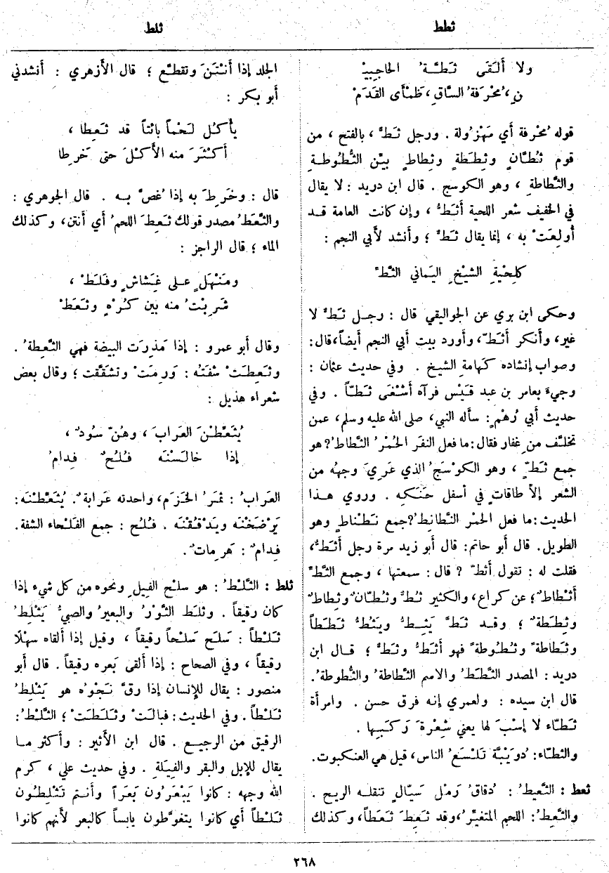 ؟ جَمْعُ نَطْناطٍ وَهُوَ الطَّوِيلُ. قَالَ أَبو حَاتِمٍ: قَالَ أَبو زَيْدٍ مَرَّةً رَجُلٌ أَثَطُّ، فَقُلْتُ لَهُ: تَقُولُ أَثطّ؟ قَالَ: سَمِعْتُهَا، وَجَمْعُ الثَّطِّ أَثْطاطٌ؛ عَنْ كُرَاعٍ، وَالْكَثِيرُ ثُطٌّ وثُطّانٌ وثِطاطٌ وثِطَطةٌ؛ وَقَدْ ثَطَّ يَثِطُّ ويَثُطُّ ثَطَطاً وثَطاطةً وثُطُوطةً فَهُوَ أَثَطُّ وثَطٌّ؛ قَالَ ابْنُ دُرَيْدٍ: الْمَصْدَرُ الثَّطَطُ وَالِاسْمُ الثَّطاطةُ والثُّطوطةُ. قَالَ ابْنُ سِيدَهْ: وَلَعَمْرِي إِنه فَرْقٌ حَسَنٌ. وامرأَة ثَطّاء لَا إِسْبَ لَهَا يَعْنِي شِعْرةَ رَكَبِها. وَالثَّطَّاءُ: دُوَيْبَّة تَلْسَعُ النَّاسَ، قيل هي العنكبوت.