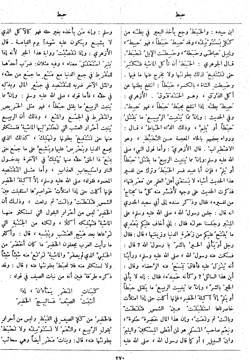 ، فإِن أَبا عُبَيْدٍ فَسَّرَ الحَبَطَ وَتَرَكَ مِنْ تَفْسِيرِ هَذَا الْحَدِيثِ أَشياء لَا يَستغْني أَهلُ العلمِ عَنْ مَعْرِفتها، فَذَكَرْتُ الْحَدِيثَ عَلَى وَجْهِهِ لأُفَسِّر مِنْهُ كلَّ مَا يحتاجُ مِنْ تَفْسِيرِهِ، فَقَالَ وذَكر سَنَدَهُ إِلى