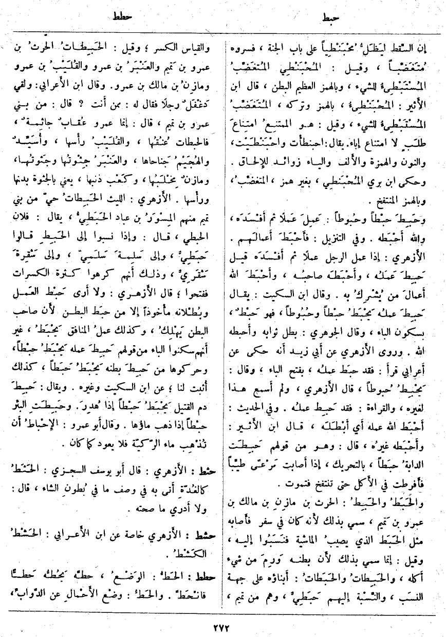 ، فَسَّرُوهُ مُتَغَضِّباً، وَقِيلَ: المُحْبَنْطِي المُتغَضِّبُ المُسْتَبْطِئُ لِلشَّيْءِ، وَبِالْهَمْزِ الْعَظِيمُ الْبَطْنِ، قَالَ ابْنُ الأَثير: المُحْبَنْطِئُ، بِالْهَمْزِ وَتَرْكِهِ، المُتَغَضِّبُ المُسْتَبْطِئُ لِلشَّيْءِ، وَقِيلَ: هُوَ الممتنِعُ امتِناعَ طلَبٍ لَا امْتِنَاعَ إِباء. يُقَالُ: احبنطأْت واحْبَنْطَيْت، وَالنُّونُ وَالْهَمْزَةُ والأَلف وَالْيَاءُ زَوَائِدُ للإِلحاق. وَحَكَى ابْنُ بَرِّيٍّ المُحْبَنطِي، بِغَيْرِ هَمْزٍ، المتغضِّبُ، وَبِالْهَمْزِ الْمُنْتَفِخُ. وحَبِطَ حبْطاً وحُبوطاً: عَمِلَ عَملًا ثُمَّ أَفْسَدَه، وَاللَّهُ أَحْبَطه. وَفِي التَّنْزِيلِ: فَأَحْبَطَ أَعْمالَهُمْ*