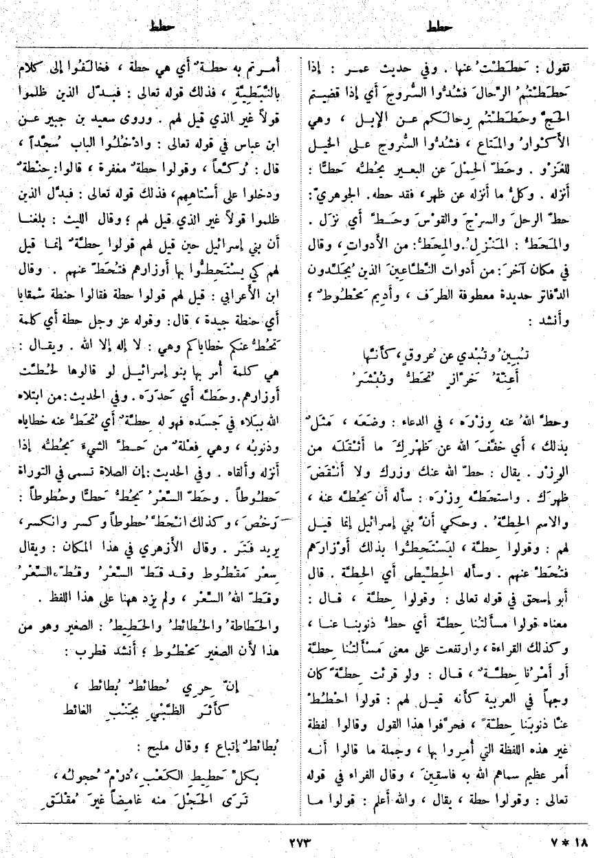وحطَّ اللهُ عَنْهُ وِزْرَه، فِي الدُّعَاءِ: وضَعَه، مَثَلٌ بِذَلِكَ، أَي خفَّفَ اللَّهُ عَنْ ظَهْرِكَ مَا أَثْقَلَه مِنَ الوِزْر. يُقَالُ: حَطَّ اللَّهُ عَنْكَ وِزْرَكَ وَلَا أَنْقَضَ ظهرَك. واستحَطَّه وِزْرَه: سأَله أَن يَحُطَّه عَنْهُ، وَالِاسْمُ الحِطَّةُ. وَحُكِيَ أَنَّ بَنِي إِسرائيل إِنما قِيلَ لَهُمْ: وَقُولُوا حِطَّة، ليَسْتَحِطُّوا بِذَلِكَ أَوْزارَهم فتُحَطَّ عَنْهُمْ. وسأَله الحِطِّيطى أَي الحِطَّة. قَالَ أَبو إِسحق فِي قَوْلِهِ تَعَالَى: وَقُولُوا حِطَّةٌ*