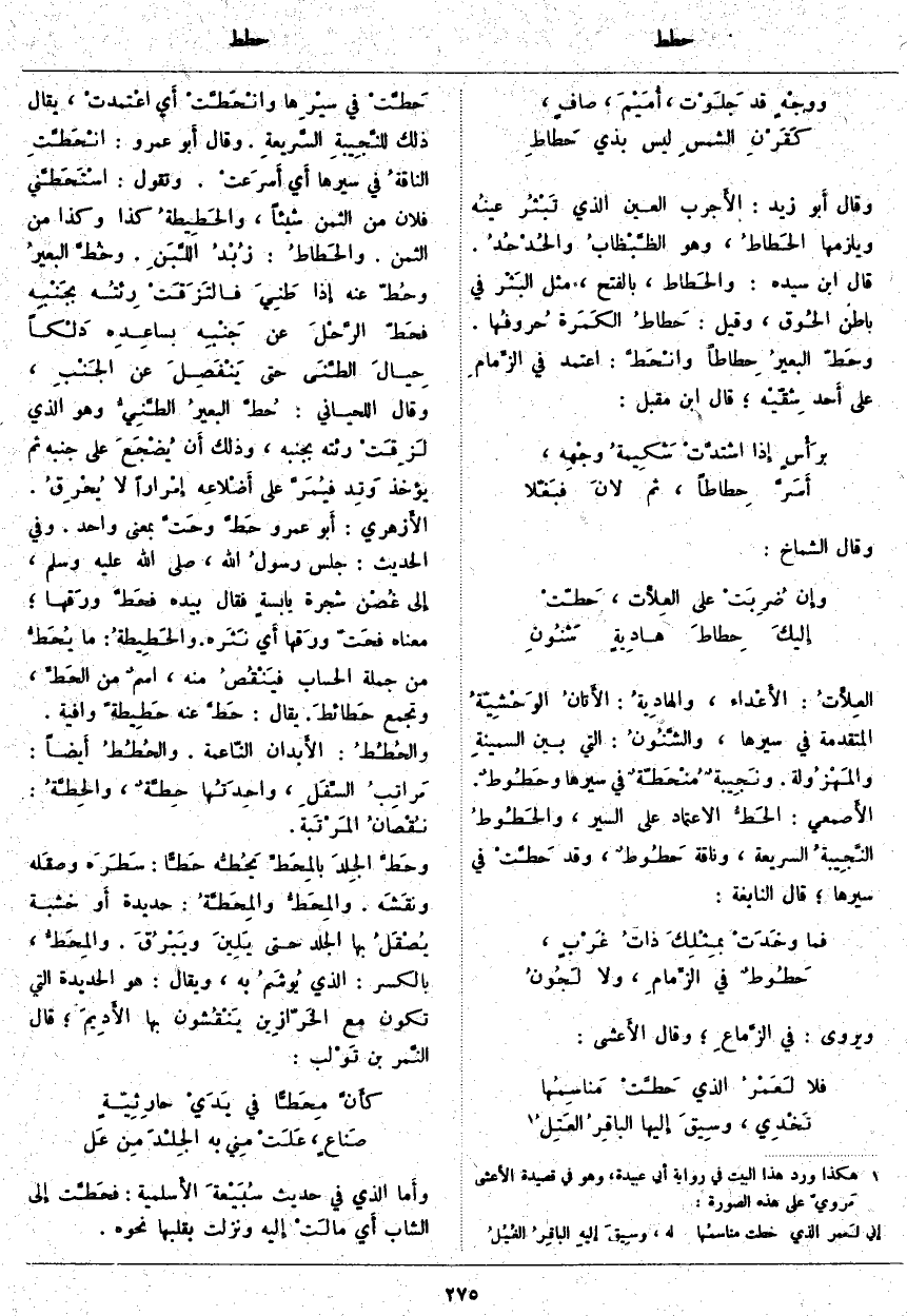 حَطَّتْ فِي سيْرِها وانْحَطَّتْ أَي اعْتمدتْ، يُقَالُ ذَلِكَ للنَّجِيبةِ السَّريعةِ. وَقَالَ أَبو عَمْرٍو: انْحَطَّتِ الناقةُ فِي سَيْرِهَا أَي أَسرَعتْ. وَتَقُولُ: اسْتَحَطَّني فُلَانٌ مِنَ الثَّمَنِ شَيْئًا، والحَطِيطةُ كَذَا وَكَذَا مِنَ الثَّمَنِ. والحَطاطُ: زُبْدُ اللَّبَن. وحُطَّ البعيرُ وحُطّ عَنْهُ إِذا طَنِيَ فالتَزَقَتْ رئتُه بجَنْبِه فحطَّ الرَّحْلَ عَنْ جَنْبِه بساعِدِه دَلْكاً حِيالَ الطَّنَى حَتَّى يَنْفَصِلَ عَنِ الجَنْبِ، وَقَالَ اللِّحْيَانِيُّ: حُطَّ البعيرُ الطَّنِيُّ وَهُوَ الَّذِي لَزِقَتْ رِئَتُهُ بِجَنْبِهِ، وَذَلِكَ أَن يُضْجَعَ عَلَى جَنْبِهِ ثُمَّ يُؤْخَذُ وَتِد فيُمَرَّ عَلَى أَضْلاعِه إِمْراراً لَا يُحْرِقُ. الأَزهري: أَبو عَمْرٍو حَطَّ وحَتَّ بِمَعْنًى وَاحِدٍ. وَفِي الْحَدِيثِ: