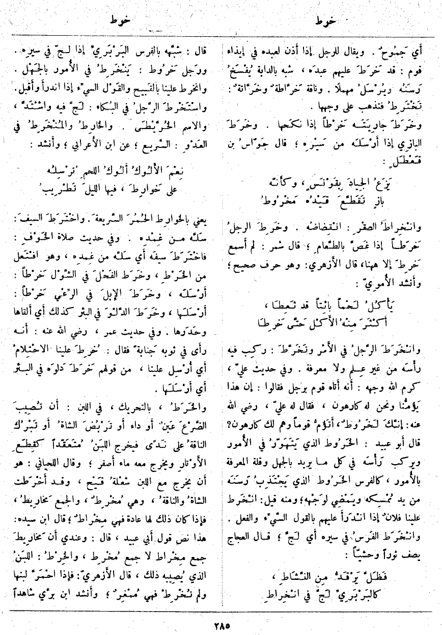 ؟ قَالَ أَبو عُبَيْدٍ: الخَرُوط الَّذِي يَتَهَوّرُ فِي الأُمور وَيَرْكَبُ رَأْسَه فِي كُلِّ مَا يُرِيدُ بِالْجَهْلِ وَقِلَّةِ الْمَعْرِفَةِ بالأُمور، كَالْفَرَسِ الخَرُوط الَّذِي يَجْتَذِبُ رَسَنَه مِنْ يَدِ مُمْسِكه ويَمْضِي لوَجْهه، وَمِنْهُ قِيلَ: انْخَرط عَلَيْنَا فلانٌ إِذا انْدَرأَ عَلَيْهِمْ بِالْقَوْلِ السَّيِء وَالْفِعْلِ. وانْخَرَط الفَرسُ فِي سَيْرِهِ أَي لَجَّ، قَالَ الْعَجَّاجِ يَصِفُ ثَوْرًا وَحْشِيًّا: