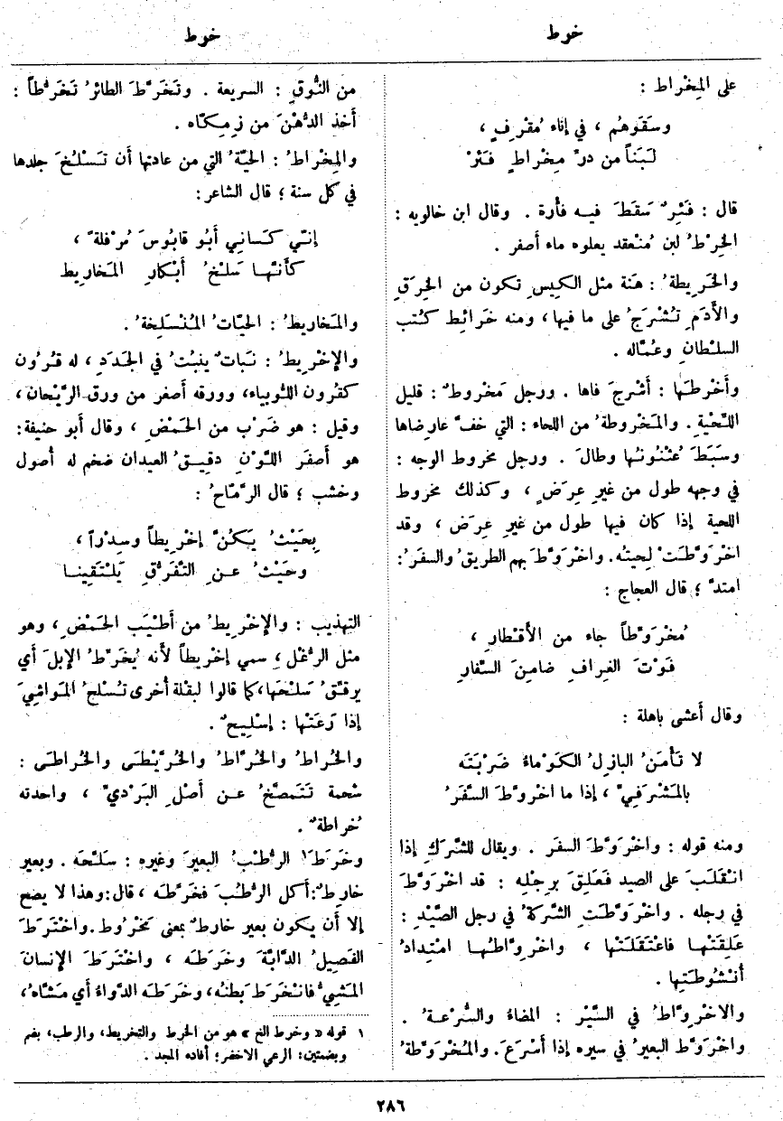 وَمِنْهُ قَوْلُهُ: واخْرَوَّطَ السفَر. وَيُقَالُ للشَّرَكِ إِذا انْقَلَبَ عَلَى الصَّيْدِ فَعَلِقَ برِجْلِه: قَدِ اخْرَوَّطَ فِي رِجْلِهِ. واخْرَوَّطَتِ الشَّركةُ فِي رِجْلِ الصَّيْدِ: عَلِقَتْها فاعْتَقَلَتْها، واخْرِوَّاطُها امْتِدادُ أُنْشُوطَتِها. والاخْرِوَّاطُ فِي السَّيْر: المضاءُ والسُّرْعةُ. واخْرَوَّط البعيرُ فِي سَيْرِهِ إِذا أَسْرَعَ. والمُخْرَوِّطةُ مِنَ النُّوقِ: السَّرِيعَةُ. وتَخَرَّطَ الطائرُ تَخَرُّطاً: أَخذ الدُّهْنَ مِنْ زِمِكَّاه. والمِخْراطُ: الحيَّةُ الَّتِي مِنْ عَادَتِهَا أَن تَسْلُخَ جِلْدَهَا فِي كُلِّ سَنَةٍ، قَالَ الشَّاعِرُ: