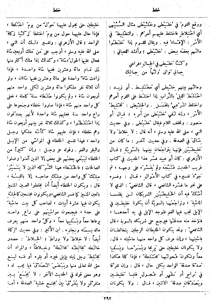 ؛ قَالَ الأَزهري: كَانَ أَبو عُبَيْدٍ فَسَّرَ هَذَا الْحَدِيثِ فِي كِتَابِ غَرِيبِ الْحَدِيثِ فَثَبَّجَه وَلَمْ يُفَسِّرُه عَلَى وَجْهِهِ، ثُمَّ جَوَّدَ تَفْسِيرَهُ فِي كِتَابِ الأَمْوالِ، قَالَ: وَفَسَّرَهُ عَلَى نَحْوِ مَا فَسَّرَهُ الشَّافِعِيُّ، قَالَ الشَّافِعِيُّ: الَّذِي لَا أَشُكّ فِيهِ أَن الخَلِيطَيْنِ الشَّرِيكَانِ لَنْ يَقْتَسِمَا الْمَاشِيَةَ، وتراجُعُهما بِالسَّوِيَّةِ أَن يَكُونَا خَلِيطَيْنِ فِي الإِبل تَجِبُ فِيهَا الْغَنَمُ فَتُوجَدُ الإِبل فِي يَدِ أَحدهما، فَتُؤْخَذُ مِنْهُ صدقتُها فَيَرْجِعُ عَلَى شَرِيكِهِ بِالسَّوِيَّةِ، قَالَ الشَّافِعِيُّ: وَقَدْ يَكُونُ الْخَلِيطَانِ الرَّجُلَيْنِ يَتَخَالَطَانِ بِمَاشِيَتِهِمَا، وإِن عَرَفَ كُلُّ وَاحِدٍ مِنْهُمَا مَاشِيَتَهُ، قَالَ: وَلَا يَكُونَانِ خَلِيطَيْنِ حَتَّى يُرِيحا ويُسَرِّحا ويَسْقِيا مَعًا وتكونَ فُحولُهما مُخْتَلِطةً، فإِذا كَانَا هَكَذَا صَدّقا صدقةَ الْوَاحِدِ بِكُلِّ حَالٍ، قَالَ: وإِن تفرَّقا فِي مُراحٍ أَو سَقْيٍ أَو فُحولٍ فَلَيْسَا خَليطين ويُصَدِّقانِ صدقةَ الِاثْنَيْنِ، قَالَ: وَلَا يَكُونَانِ خَلِيطَيْنِ حَتَّى يَحُولَ عَلَيْهِمَا حَوْلٌ مِنْ يومَ اخْتَلطا، فإِذا حَالَ عَلَيْهِمَا حَوْلٌ مِنْ يومَ اخْتَلَطَا زَكَّيا زكاةَ الْوَاحِدِ؛ قَالَ الأَزهري: وَتَفْسِيرُ ذَلِكَ أَن النَّبِيَّ، صَلَّى اللَّهُ عَلَيْهِ وَسَلَّمَ، أَوجب عَلَى مَن مَلك أَربعين شَاةً فَحَالَ عَلَيْهَا الحولُ، شَاةً، وَكَذَلِكَ إِذا مَلَكَ أَكثر مِنْهَا إِلى تَمَامِ مِائَةٍ وَعِشْرِينَ فَفِيهَا شَاةٌ وَاحِدَةٌ، فإِذا زَادَتْ شاةٌ وَاحِدَةٌ عَلَى مِائَةٍ وَعِشْرِينَ فَفِيهَا شَاتَانِ، وَلَوْ أَن ثَلَاثَةَ نَفَرٍ مَلَكُوا مِائَةً وَعِشْرِينَ لِكُلِّ وَاحِدٍ مِنْهُمْ أَربعون شَاةً، وَلَمْ يَكُونُوا خُلَطاء سَنَةً كَامِلَةً، فَعَلَى كُلِّ وَاحِدٍ مِنْهُمْ شَاةٌ، فإِذا صَارُوا خُلَطَاءَ وَجَمَعُوهَا عَلَى رَاعٍ وَاحِدٍ سَنَةً فَعَلَيْهِمْ شَاةٌ وَاحِدَةٌ لأَنهم يُصَدِّقُونَ إِذا اخْتَلَطُوا، وَكَذَلِكَ ثَلَاثَةُ نَفَرٍ بَيْنَهُمْ أَربعون شَاةً وَهُمْ خُلَطَاءُ، فَإِنَّ عَلَيْهِمْ شَاةً كأَنّه مَلَكَهَا رَجُلٌ وَاحِدٌ، فَهَذَا تَفْسِيرُ الْخُلَطَاءِ فِي الْمَوَاشِي مِنَ الإِبل وَالْبَقَرِ وَالْغَنَمِ. وَقَوْلُهُ عَزَّ وَجَلَّ: وَإِنَّ كَثِيراً مِنَ الْخُلَطاءِ لَيَبْغِي بَعْضُهُمْ عَلى بَعْضٍ إِلَّا الَّذِينَ آمَنُوا وَعَمِلُوا الصَّالِحاتِ