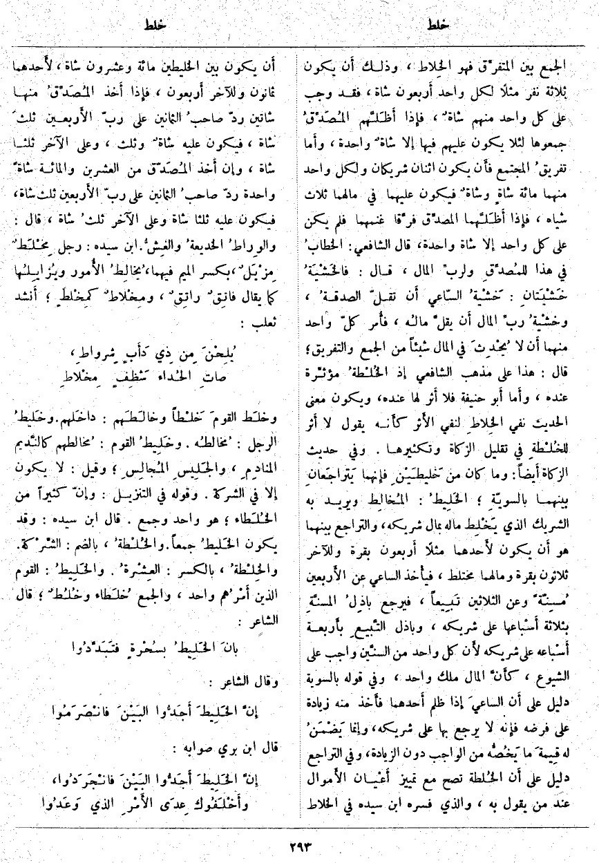 ؛ الخَلِيطُ: المُخالِط وَيُرِيدُ بِهِ الشَّرِيكَ الَّذِي يَخْلِط مَالَهُ بِمَالِ شَرِيكِهِ، وَالتَّرَاجُعُ بَيْنَهُمَا هُوَ أَن يَكُونَ لأَحدهما مَثَلًا أَربعون بَقَرَةً وَلِلْآخَرِ ثَلَاثُونَ بَقَرَةً وَمَالُهُمَا مُخْتَلِطٌ، فيأْخذ السَّاعِي عَنِ الأَربعين مُسِنّةً وَعَنِ الثَّلَاثِينَ تَبِيعاً، فَيَرْجِعُ باذِلُ المسنَّةِ بِثَلَاثَةِ أَسْباعها عَلَى شَرِيكِهِ، وَبَاذِلِ التَّبيعِ بأَربعة أَسْباعه عَلَى شَرِيكِهِ لأَن كُلَّ وَاحِدٍ مِنَ السنَّين وَاجِبٌ عَلَى الشُّيُوعِ، كأَنَّ الْمَالَ مِلْكُ وَاحِدٍ، وَفِي قَوْلِهِ بِالسَّوِيَّةِ دَلِيلٌ عَلَى أَن الساعيَ إِذا ظَلَمَ أَحدهما فأَخذ مِنْهُ زِيَادَةً عَلَى فَرْضِهِ فإِنه لَا يَرْجِعُ بِهَا عَلَى شَرِيكِهِ، وإِنما يَضْمَنُ لَهُ قِيمةَ مَا يَخُصُّه مِنَ الْوَاجِبِ دُونَ الزِّيَادَةِ، وَفِي التَّرَاجُعِ دَلِيلٌ عَلَى أَن الخُلطة تَصِحُّ مَعَ تَمْيِيزِ أَعْيان الأَموال عِنْدَ مَنْ يَقُولُ بِهِ، وَالَّذِي فَسَّرَهُ ابْنُ سِيدَهْ فِي الْخِلَاطِ أَن يَكُونَ بَيْنَ الْخَلِيطَيْنِ مِائَةٌ وَعِشْرُونَ شَاةً، لأَحدهما ثَمَانُونَ وَلِلْآخَرِ أَربعون، فإِذا أَخذ المُصَدِّقُ مِنْهَا شَاتَيْنِ رَدَّ صاحبُ الثَّمَانِينَ عَلَى رَبِّ الأَربعين ثلثَ شَاةٍ، فَيَكُونُ عَلَيْهِ شاةٌ وَثُلْثٌ، وَعَلَى الْآخَرِ ثُلْثَا شَاةٍ، وإِن أَخذ المُصَدّق مَنَ الْعِشْرِينَ وَالْمِائَةِ شَاةً، وَاحِدَةً رَدَّ صاحبُ الثَّمَانِينَ عَلَى رَبِّ الأَربعين ثُلْثَ شَاةٍ، فَيَكُونُ عَلَيْهِ ثُلْثَا شَاةٍ وَعَلَى الْآخَرِ ثلثُ شَاةٍ، قَالَ: والوِراطُ الخديعةُ والغِشُّ. ابْنُ سِيدَهْ: رَجُلٌ مِخْلَطٌ مِزْيَلٌ، بِكَسْرِ الْمِيمِ فِيهِمَا، يُخالِطُ الأُمور ويُزايِلُها كَمَا يُقَالُ فاتِقٌ راتِقٌ، ومِخْلاطٌ كمِخْلطٍ؛ أَنشد ثَعْلَبٌ: