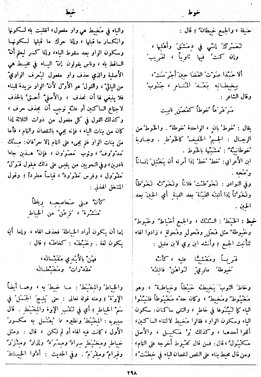 وخاطَ الثوبَ يَخِيطُه خَيْطاً وخِياطةً، وَهُوَ مَخْيوطٌ ومَخِيطٌ، وَكَانَ حَدُّهُ مَخْيوطاً فلَيَّنُوا الْيَاءَ كَمَا لَيَّنُوها فِي خاطٍ، وَالْتَقَى سَاكِنَانِ: سُكُونُ الْيَاءِ وَسُكُونُ الْوَاوِ، فَقَالُوا مَخِيط لِالْتِقَاءِ السَّاكِنَيْنِ، أَلقوا أَحدهما، وَكَذَلِكَ بُرٌّ مَكِيل، والأَصل مَكْيُولٌ، قَالَ: فَمَنْ قَالَ مَخْيوط أَخرجه عَلَى التَّمَامِ، وَمَنْ قَالَ مَخِيطٌ بَنَاهُ عَلَى النَّقْصِ لِنُقْصَانِ الْيَاءِ فِي خِطْتُ، وَالْيَاءُ فِي مَخِيط هِيَ وَاوَ مَفْعُولٍ، انْقَلَبَتْ يَاءً لِسُكُونِهَا وَانْكِسَارِ مَا قَبْلَهَا، وإِنما حُرِّكَ مَا قَبْلَهَا لِسُكُونِهَا وَسُكُونِ الْوَاوِ بَعْدَ سُقُوطِ الْيَاءِ، وإِنما كُسِرَ لِيُعْلَمَ أَنّ السَّاقِطَ يَاءٌ، وَنَاسٌ يَقُولُونَ إِنّ الْيَاءَ فِي مَخِيطٍ هِيَ الأَصلية وَالَّذِي حُذِفَ وَاوُ مَفْعُولٍ ليُعرف الْوَاوِيُّ مِنَ الْيَائِيِّ، والقولُ هُوَ الأَوّل لأَنّ الْوَاوَ مَزِيدَةٌ لِلْبِنَاءِ فَلَا يَنْبَغِي لَهَا أَن تُحْذَفَ، والأَصليّ أَحقُّ بِالْحَذْفِ لِاجْتِمَاعِ السَّاكِنَيْنِ أَو علَّةٍ تُوجِبُ أَن يُحْذَفَ حَرْفٌ، وَكَذَلِكَ الْقَوْلُ فِي كُلِّ مَفْعُولٍ مِنْ ذَوَاتِ الثَّلَاثَةِ إِذا كَانَ مِنْ بَنَاتِ الْيَاءِ، فإِنه يَجِيءُ بِالنُّقْصَانِ وَالتَّمَامِ، فأَما مِنْ بَنَاتِ الْوَاوِ فَلَمْ يَجِئْ عَلَى التَّمَامِ إِلا حَرْفان: مِسْك مَدْوُوفٌ، وَثَوْبٌ مَصْوُون، فإِنَّ هَذَيْنِ جَاءَا نَادِرَيْنِ، وَفِي النَّحْوِيِّينَ مَنْ يَقِيسُ عَلَى ذَلِكَ فَيَقُولُ قَوْلٌ مَقْوُول، وَفَرَسٌ مَقْوُودٌ، قِيَاسًا مُطَّرِدًا؛ وَقَوْلُ الْمُتَنَخِّلِ الْهُذَلِيِّ: